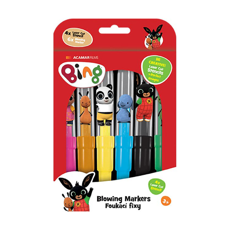 Balení obsahuje 6 barevných foukacích fixů s potiskem a 4 barevné papírové šablonky v oblíbených pohádkových motivech Bing.