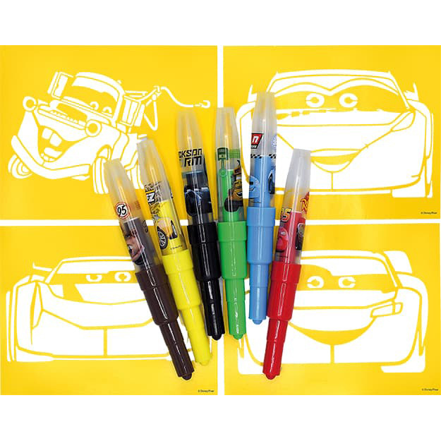 Balení obsahuje 6 barevných foukacích fixů s potiskem a 4 barevné papírové šablonky v oblíbených pohádkových motivech.