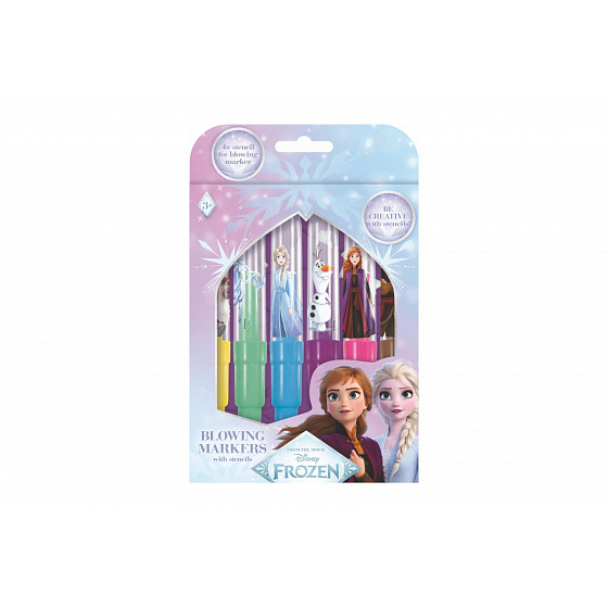Balení obsahuje 6 barevných foukacích fixů s potiskem a 4 barevné papírové šablonky v oblíbených motivech.