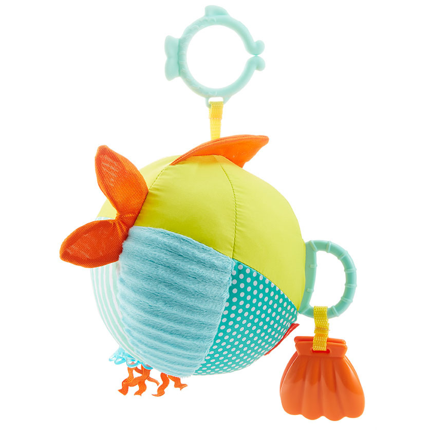 Rozkošný mořský kamarád ve tvaru koule je z různých materiálů a má na sobě mnoho vzorů, takže vaše děťátko bude mít stále co zkoumat. Pro rozvoj hmatu jsou určeny plastová ploutvička, vroubkovaný ocásek a buclaté zdobené rukojeti s klapátkem a chrastící medúzou s látkovými chapadly. O stimulaci sluchu se zase postará rolnička uvnitř rybičky. Díky poutku můžete navíc hračku připevnit ke kolébce nebo kočárku.