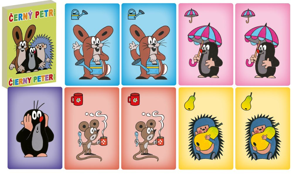 24 karet + karta s černým Petrem + karta s návodem ke hře , materiál krabičky i karet pevný karton s lesklou povrchovou úpravou-voděodpudivá, krabička papírová z důvodu tradice i bezpečnosti dětí, na výrobek byla udělena ocenění "česká kvalita" a "bezpečná a kvalitní hračka"