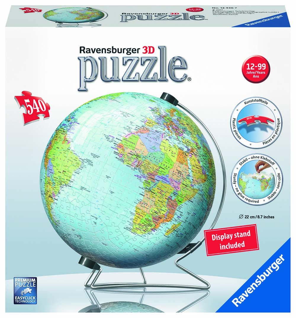 3D puzzle puzzleball Globus se stojánkem. Globus se skládá z plastových dílků, které po složení tvoří mapu světa a je to skvělá pomůcka do školy i jako doplněk do dětských pokojů. Průměr složeného glóbu je 22cm. Baleno v krabici. Doporučený věk 12+