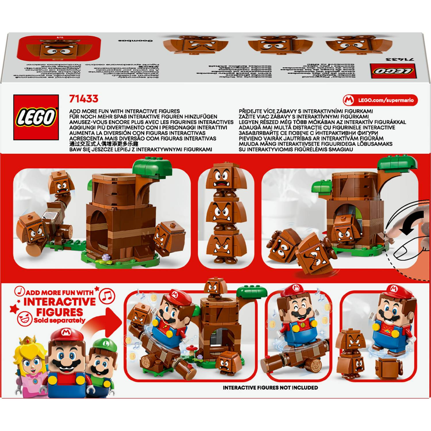 Užijte si zábavu s tímto parádním a dobrodružným setem pro děti LEGO® Super Mario™ (71433) Goombové na hřišti. Tento sběratelský kousek Nintendo®, který je skvělým dárkem pro kluky, holky a všechny fanoušky Super Maria od 7 let, obsahuje 3 figurkyGoomby, a k tomu navíc sestavitelný kmen stromu a houpačku pro kreativní hraní. Stisknutím páčky na zadní straně sestavitelného kmene stromu na vás vyskočí Goomba. Pohoupejte Goomby na houpačce nebo naskládejte všechny 3 Goomby na sebe a postavte Goomb ověž. Přidejte k tomuto setu figurku LEGO® Maria, LEGO® Luigiho nebo LEGO® Peach™ (ze setů 71439, 71440 nebo 71441 – prodávají se samostatně) a užijte si interaktivní výzvu v balancování na houpačce. Návod na stavění pro tento set najdete v krabici nebo v doprovodné aplikaci LEGO Super Mario. Ta slouží jako bezpečná platforma, kde mohou děti sdílet své výtvory, a najdete v ní také originální nápady na stavění a hraní. Rozměry – Kmen stromu a model houpačky měří přes 10 cm na výšku, 18 cm na šířku a 12 cm do hloubky a lze je přidat do dalších setů LEGO® Super Mario™