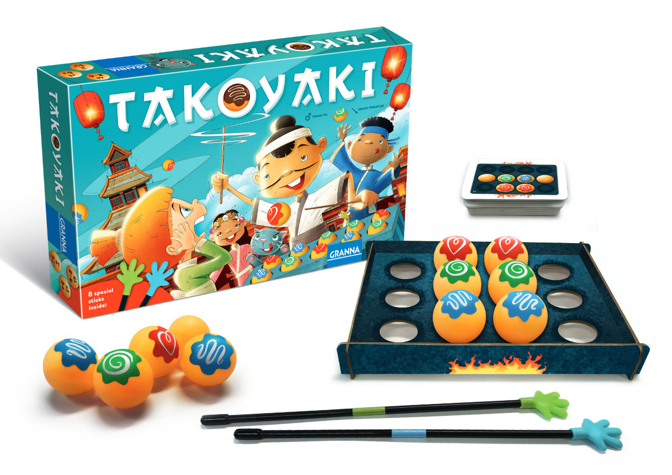 Svižná dovednostní hra pro 2 až 4 hráče od 6 let učí legendární zručnosti japonských mistrů kuchyně. Vaším úkolem je co nejrychleji dokončit 5 objednávek. Ale pozor! Jen ti nejlepší kuchaři dokáží TAKOYAKI rychle obrátit, aby se nepřipálilo!