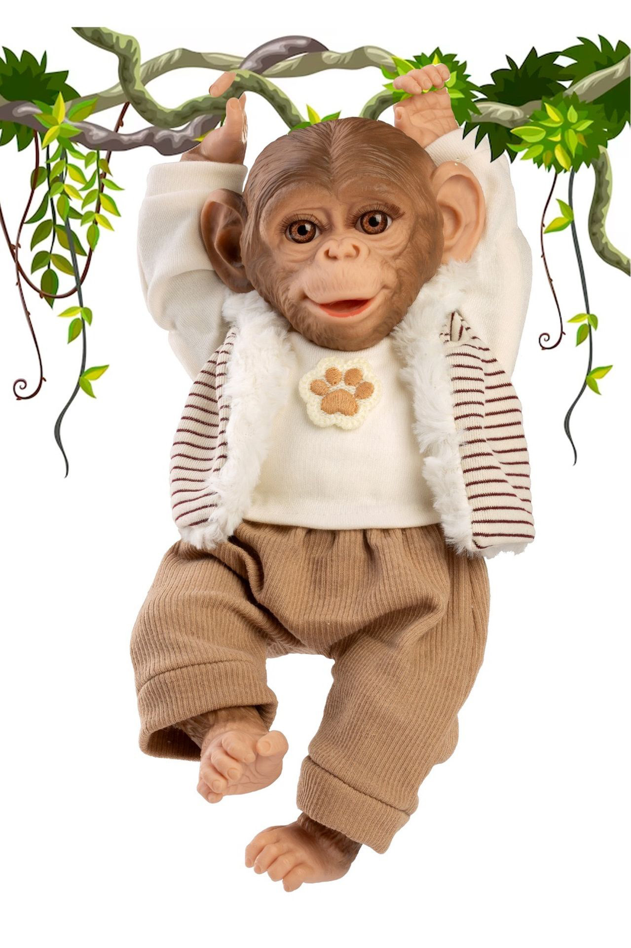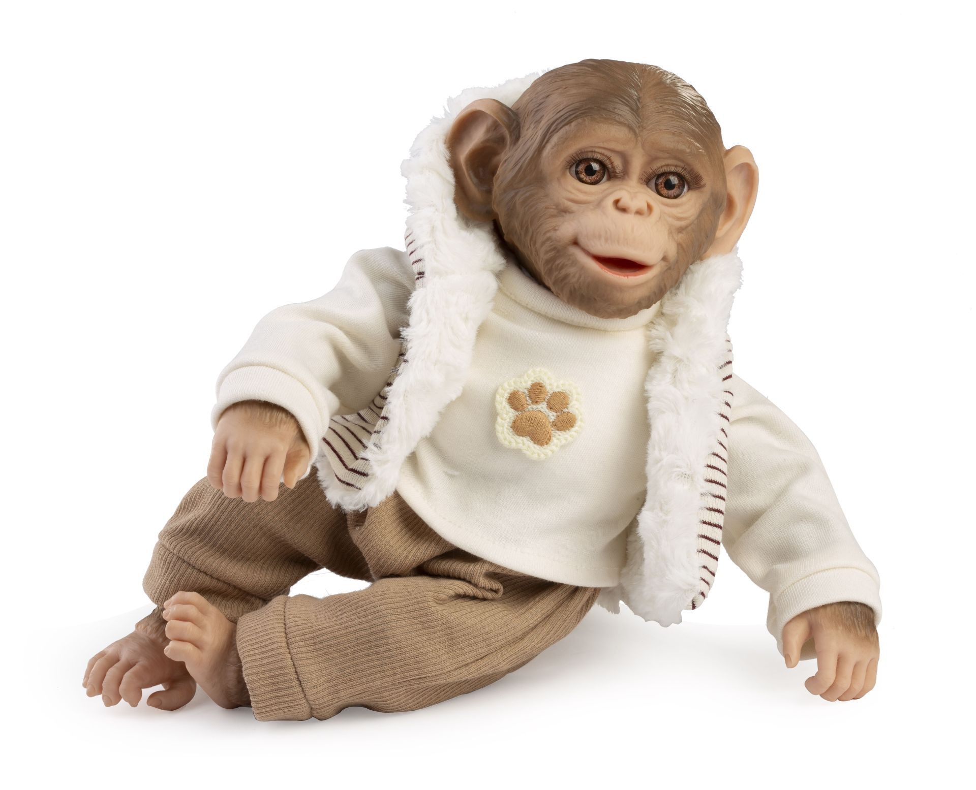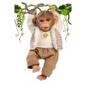 Veselé a roztomilé opičí miminko bez zvuku s měkkým látkovým tělem. Hlava a končetiny jsou vyrobené z kvalitního vinylu. Ruce a nohy jsou k tělu přichyceny kloubem. Opičí miminko je polohovací a může i sedět nebo se dá pověsit za ruce nebo nohy. Velikost 32 cm. Ručně vyrobeno ve Španělsku, baleno v dárkové krabici. Doporučený věk od 3 let.