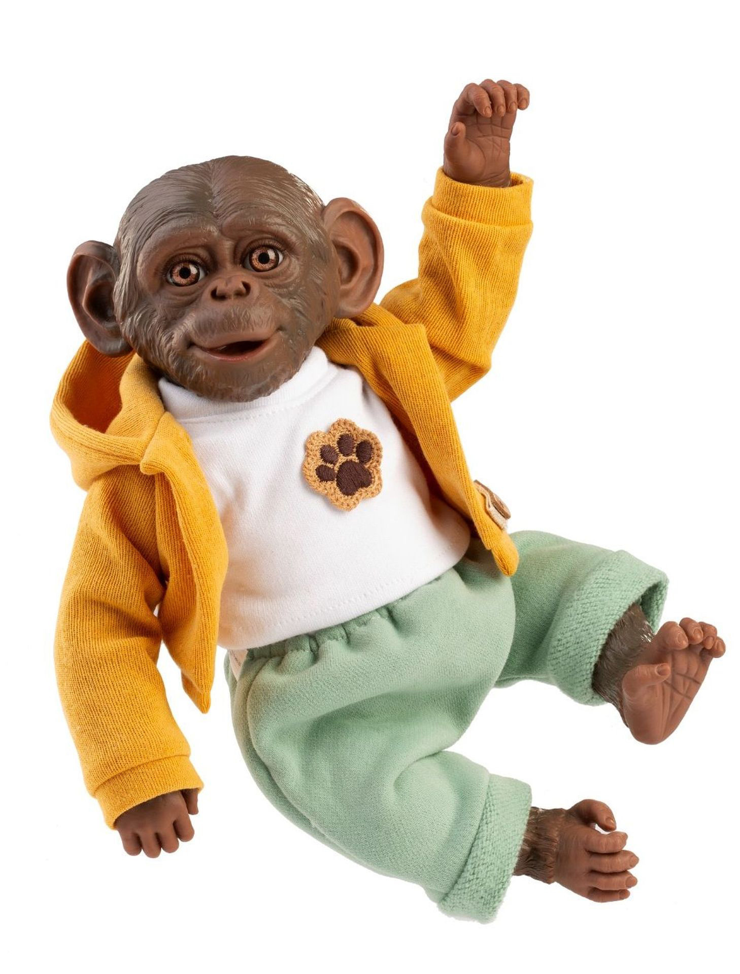 Veselé a roztomilé opičí miminko bez zvuku s měkkým látkovým tělem. Hlava a končetiny jsou vyrobené z kvalitního vinylu. Ruce a nohy jsou k tělu přichyceny kloubem. Opičí miminko je polohovací a může i sedět nebo se dá pověsit za ruce nebo nohy. Velikost 32 cm. Ručně vyrobeno ve Španělsku, baleno v dárkové krabici. Doporučený věk od 3 let.