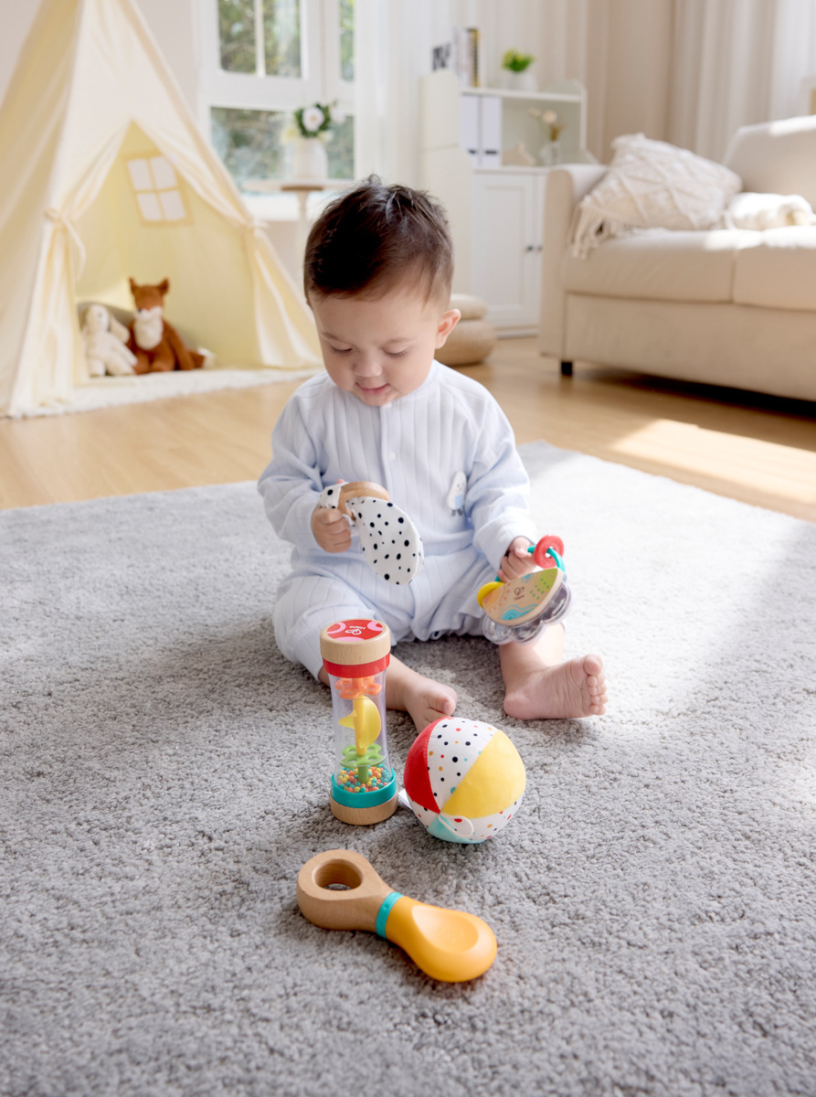 Hape senzorická sada hraček 5 v 1. Tato sada stimuluje zrakové, sluchové a hmatové smysly zářivými barvami, rozmanitými texturami a poutavými zvuky. Tato fantastická sada obsahuje tamburínu, chrastítko, látkový míček, uchopovací kroužek a dešťový filtr, vše v jedné sadě, která nabízí komplexní vývojový zážitek pro miminka. Navrženo k rozvoji vizuálních, sluchových, hmatových a uchopovacích dovedností, které pomáhají dětem učit se a růst při hraní. Rozměry balení: 24 x 30 x 8,8 cm. Doporučený věk: 0-18 měsíců.