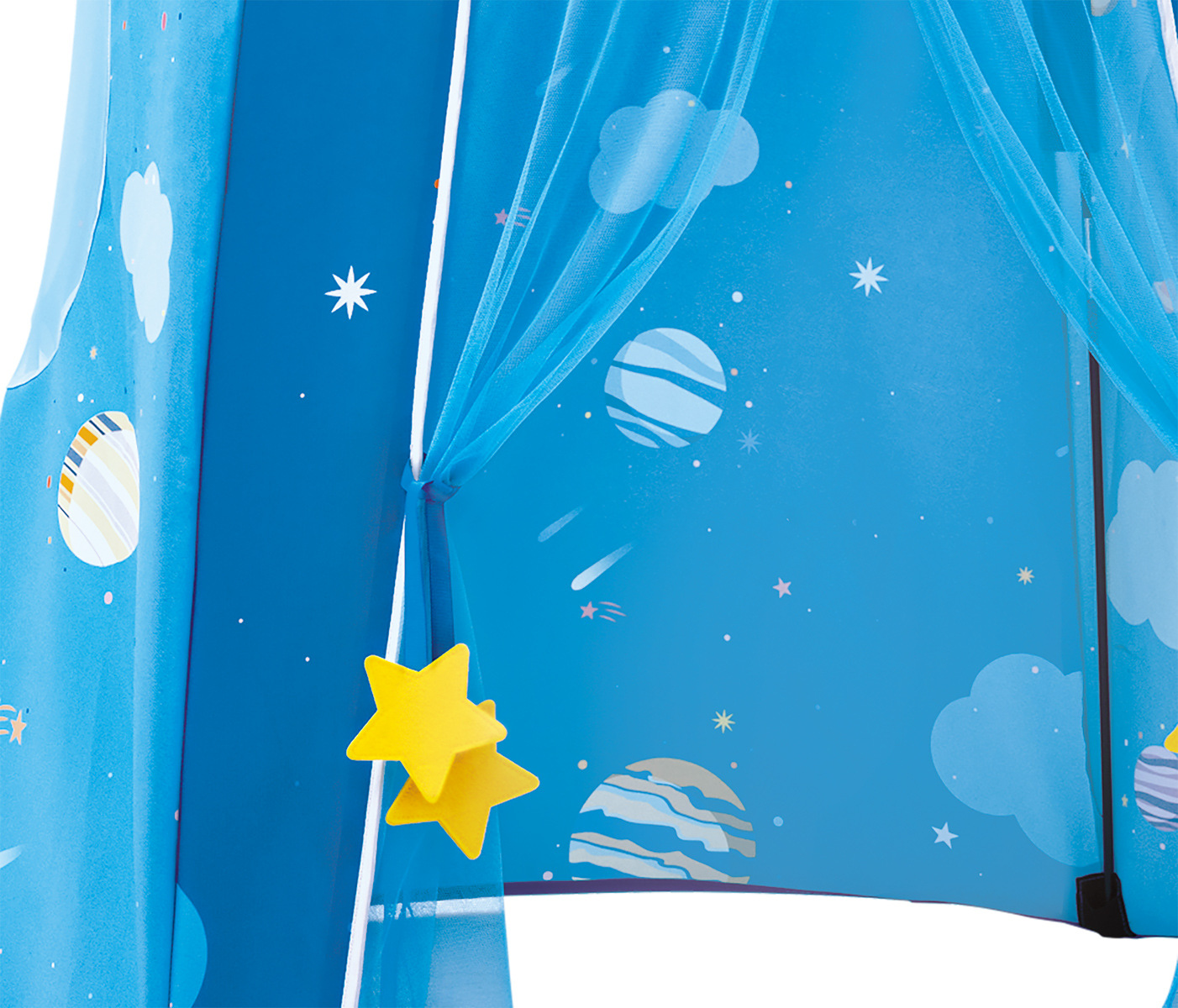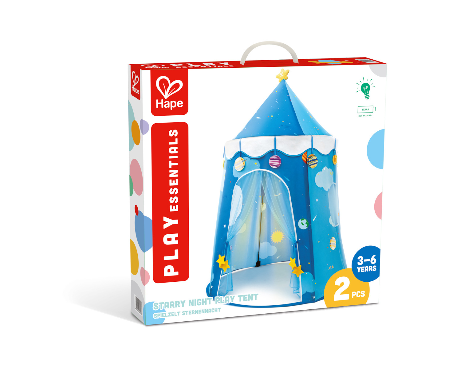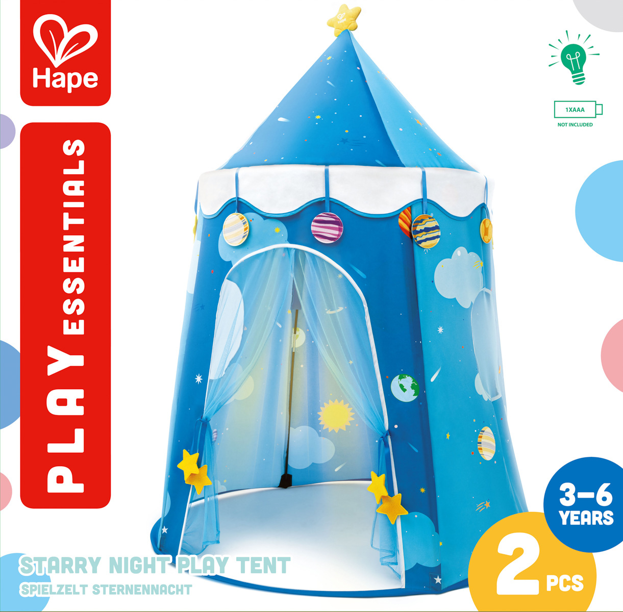 Proměňte dětské hry v kouzelné dobrodružství s tímto rozkošným stanem Hvězdná noc. Stan navržený speciálně pro nejmenší děti, nabízí bezpečný, pohodlný a zářivý prostor pro hodiny zábavy a fantazie. Roztomilý design s motivy sluneční soustavy si děti okamžitě zamilují. Vestavěná LED světla dodají stanu nádech kouzelné magie – ideální pro vyprávění příběhů, hry nebo odpočinek. Lehká skládací konstrukce, snadná montáž a demontáž. Praktická taštička na zip pro snadné uložení stanu. Baterie: 1 x AAA, není součástí. Rozměry stanu: 150 x 100 x 100 cm. Rozměry balení: 57,8 x 58 x 8,8 cm. Věk: 3+