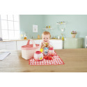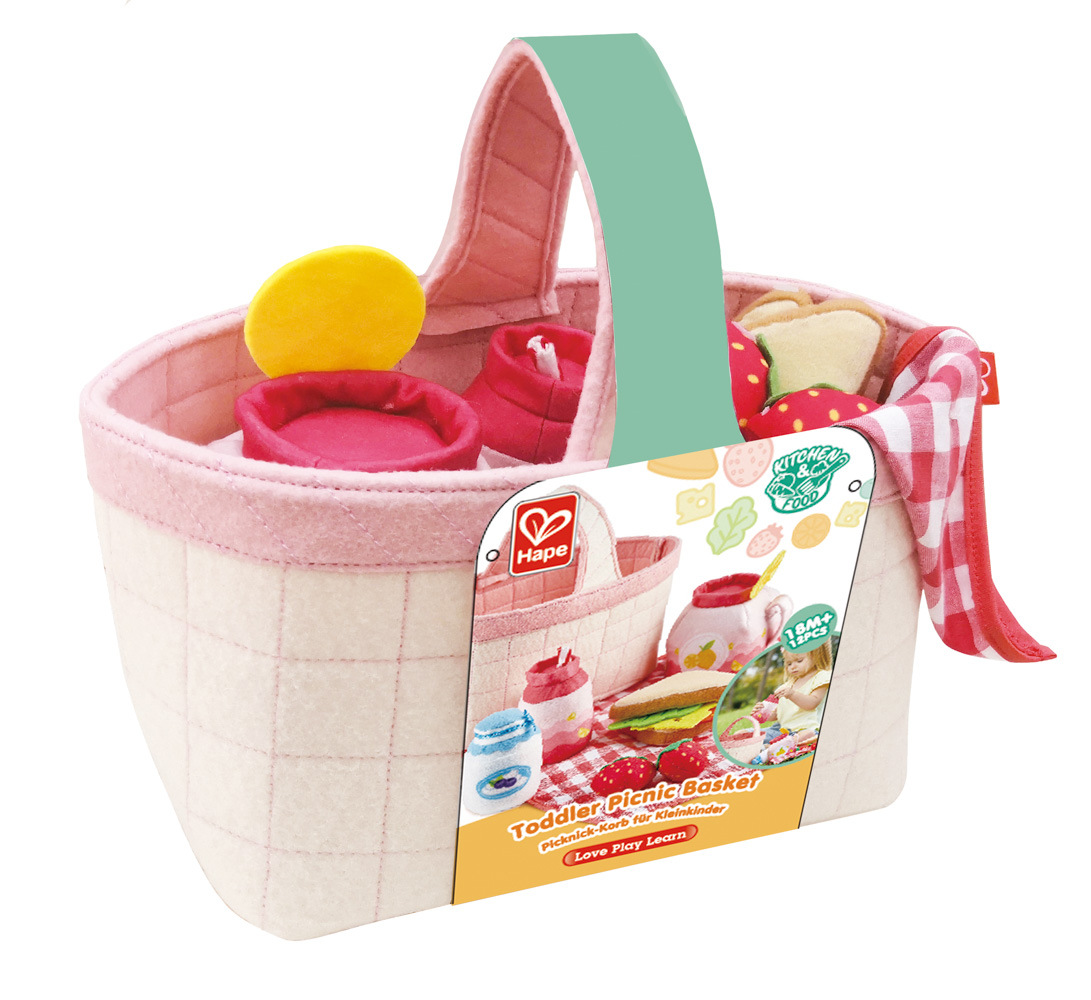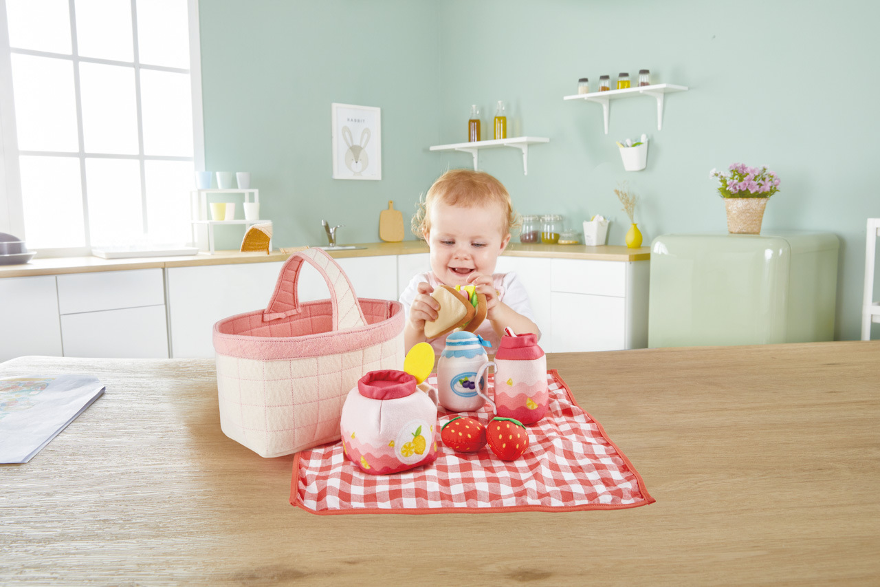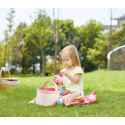 Najděte si dokonalé místo, vybalte vše z košíku a připravte si lahodný piknik! Sada obsahuje jeden látkový koš, jednu piknikovou deku, tři lahve s nápoji, dvě jahody, dva kousky chleba, jeden salátový list, jeden plátek rajčete a jeden kousek sýra na přípravu sendviče! Potraviny jsou vyrobeny z měkkého materiálu, díky čemuž jsou zábavné a snadno je uchopí i malé ručičky. Tato zábavná sada je ideální pro rozvoj hraní rolí, jazykových dovedností a lásky k pobytu venku. Rozměr balení: 28 x 25 x 18 cm. Věk: 18m+