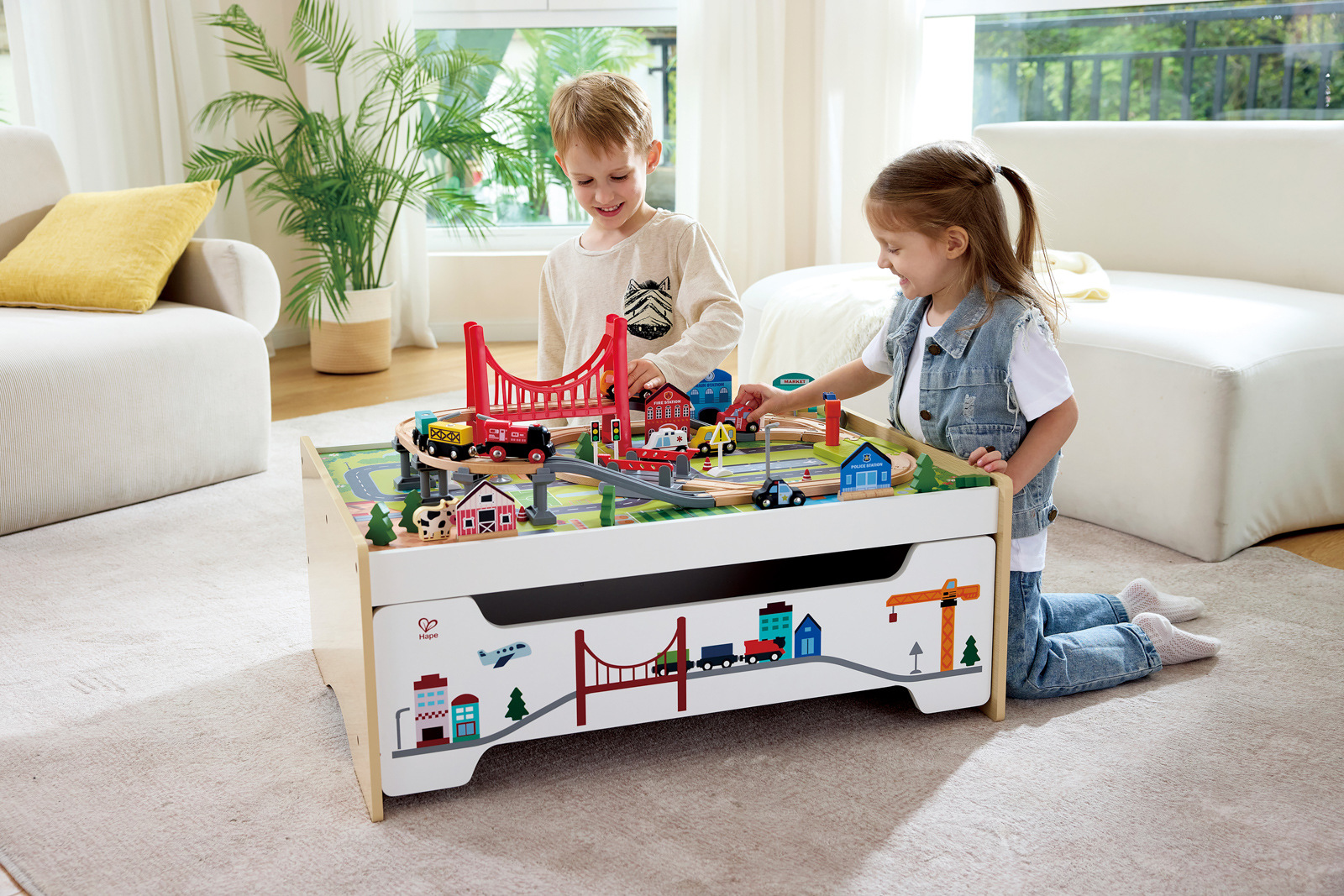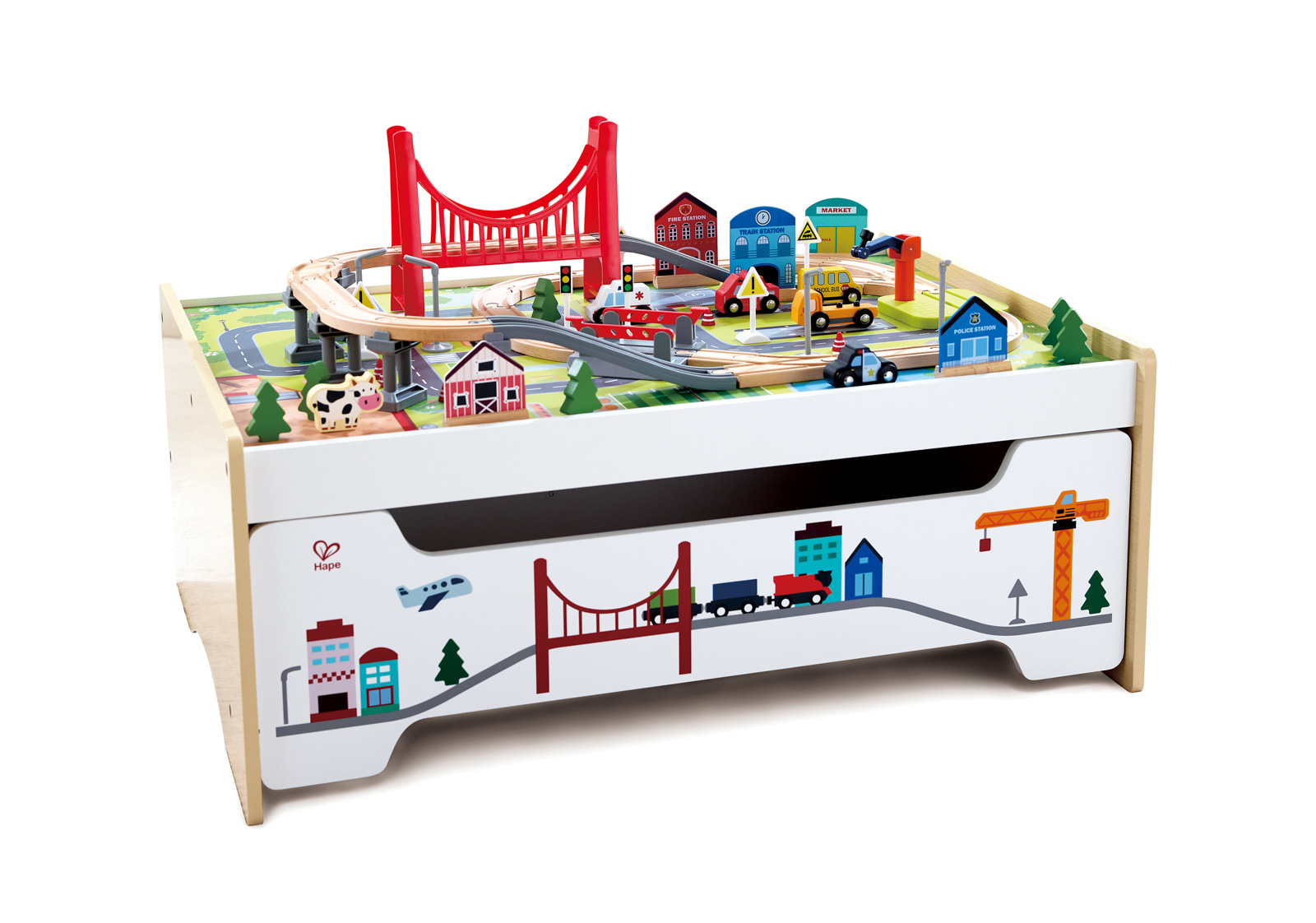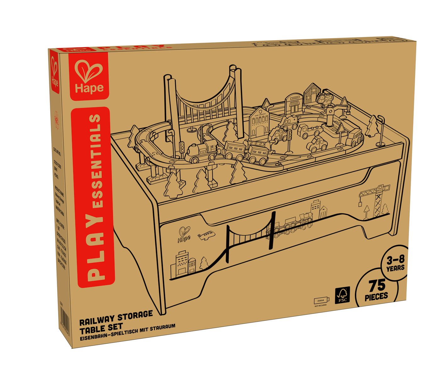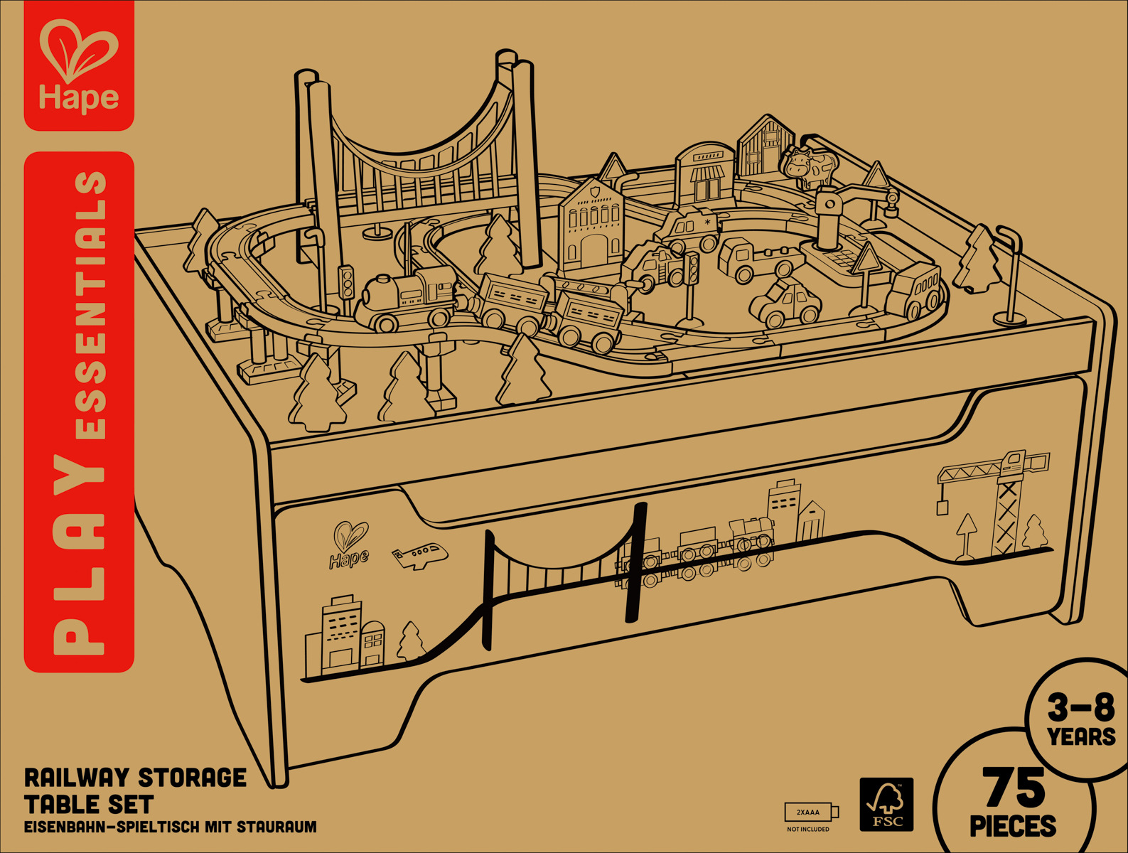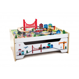 Tato železniční sada se stolem nabízí kompletně vše, co děti potřebují ke hře. Kombinací doplňků lze vytvářet jedinečné tratě a díky rozšiřitelným kolejím vznikají nekonečné možnosti pro nápaditou hru. Součástí sady je lokomotiva na baterie. Sada obsahuje 75 dílů – koleje, vagónky, most, značení a krajinky. Vyrobeno z odolného dřeva a barev na vodní bázi. Baterie: 2xAAA, nejsou součástí. Rozměry balení: 65 x 86 x 12,5 cm. Věk: 3+