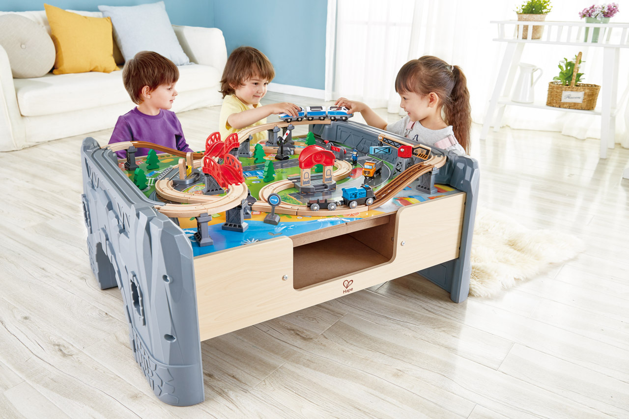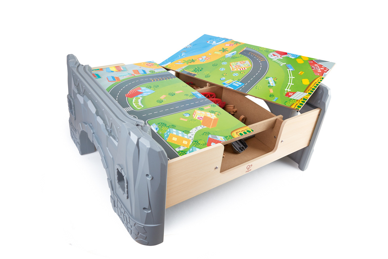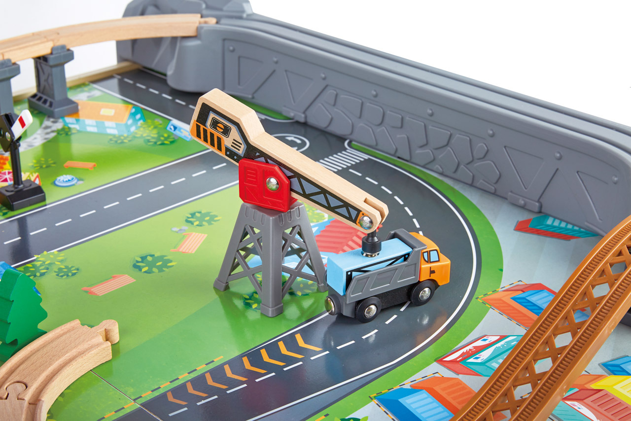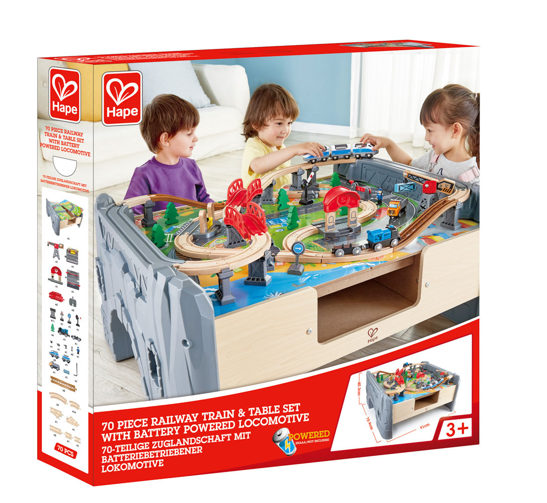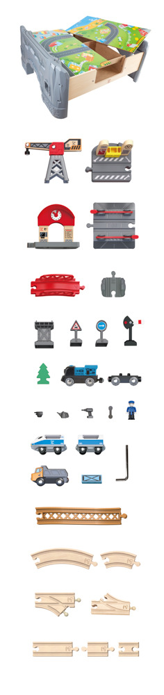 Hrací stoleček s vláčkodráhou nabízí mnoho herních variant. Na horní desce je vyobrazena hrací plocha jak pro vláčkodráhu tak silnice. Stoleček lze velmi snadno sestavit. Pod hrací deskou je praktický úložnýn prostor. Při jízdě plné fantazie lze využít na bočních plastových hranách kolejiště, které lze propojit s hrací deskou tak, že vytvoří zvýšenou úroveň hrací plochy. A to je ideální pro využití jeřábu a jeho ramene k přesunu nákladu z vlaku do nákladního auta. Sada obsahuje 70 dílků. Z toho 1 lokomotivu na baterie ( 2xAAA nejsou součástí balení). Rozměr sestaveného stolku: 904x789x403 cm výška. Věk: 3+