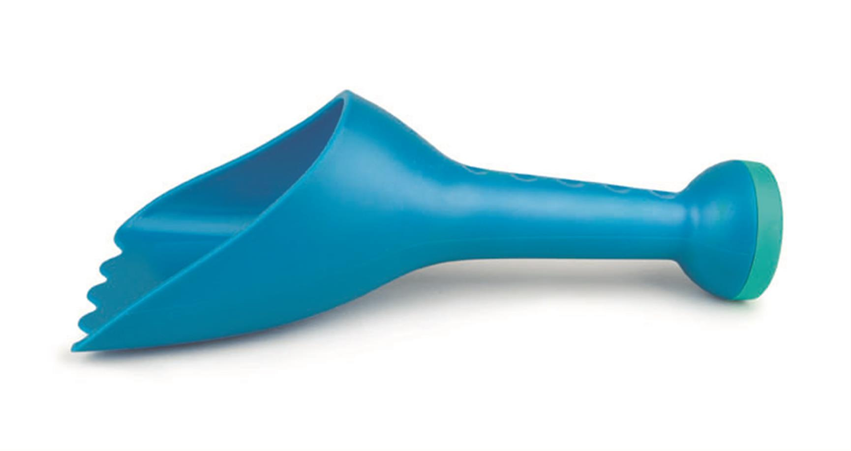 Lopatka má zuby, které pomáhají při kopání do písku nebo hlíny. Má hladké, oblé hrany a malé ručičky ji snadno uchopí a manipulují s ní.