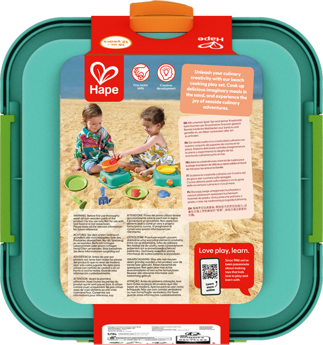 Tato sada na vaření na pláži od společnosti Hape je dokonalým společníkem pro kreativní recepty z písku a nápaditou hru. Díky nádobí a bábovkám se vaše dítě může ujmout role kuchaře a hostitele, což podněcuje představivost a vybízí ke spoustě zábavných skupinových her. Zároveň se trénuje jemná motorika, protože vaše dítě manipuluje s různými nástroji. Sadu lze snadno složit a přenášet, takže návštěva pláže bude ještě zábavnější a kreativnější. Vyrobeno z kvalitního plastu. Obsah sady: 2x vařič, 1x pánev, 1x rendlík, 2x talíř, 1x ryba, 1x oliheň, 1x vidlička, 1x naběračka a 1x sítko. Obsahuje 11 dílů. Rozměry balení: 13,5 x 19,5 x 19 cm. Věk: 18 m+