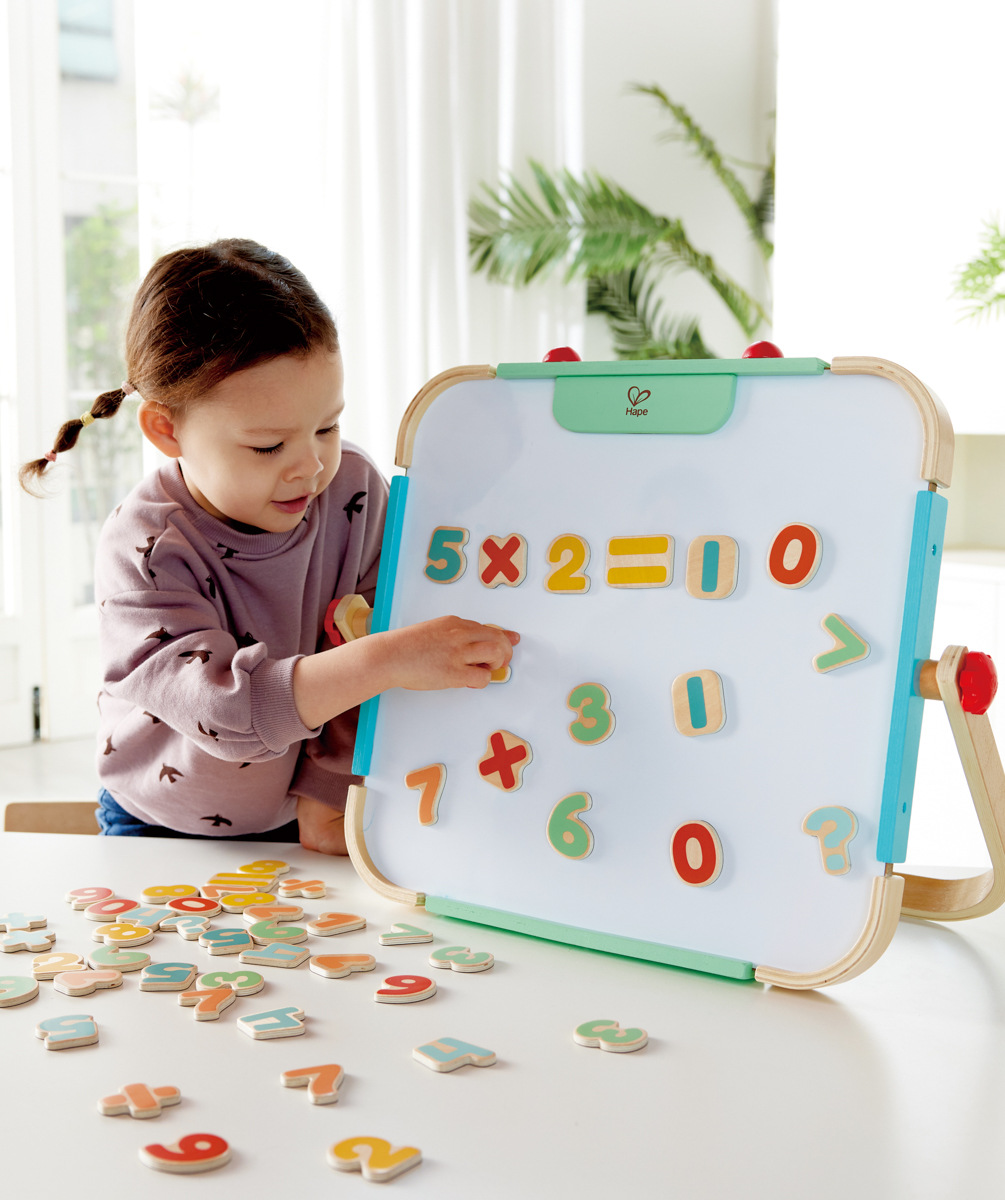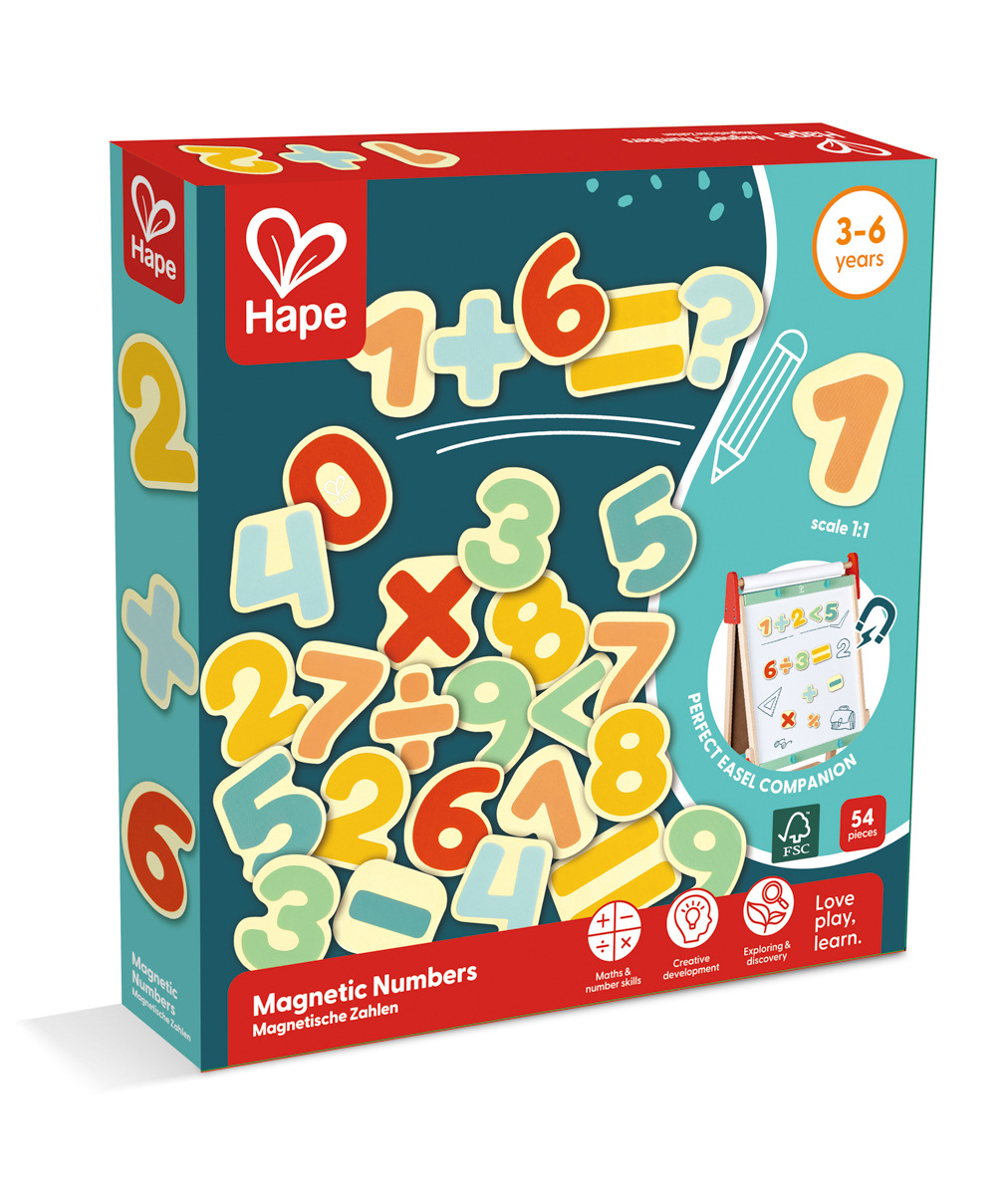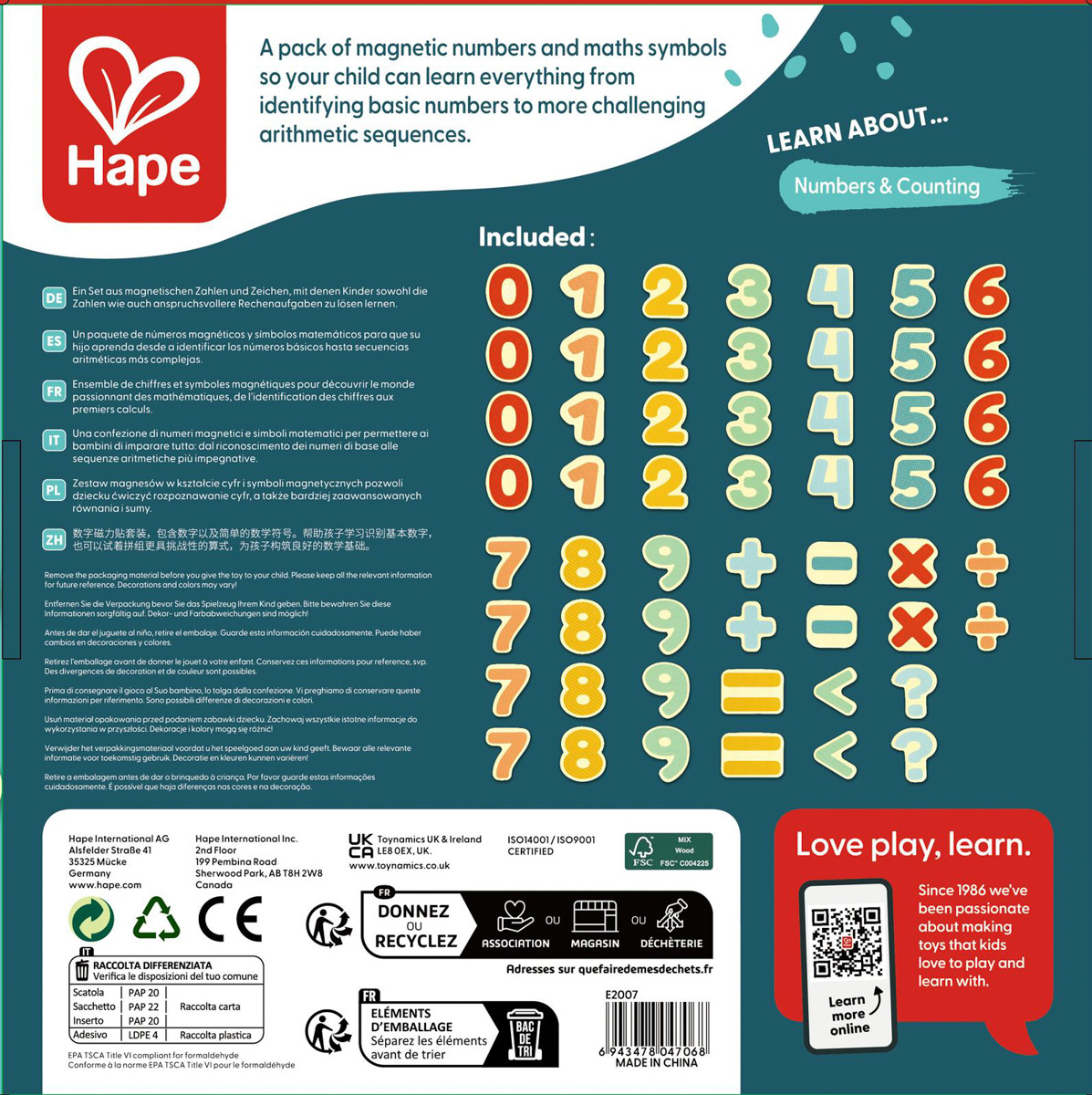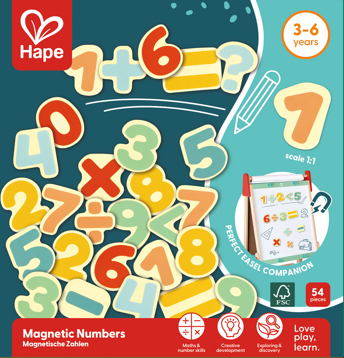 Sada magnetických čísel a matematických symbolů, díky kterým se dítě může začít učit vše od poznání základních čísel až po počítání. Lze používat na stojanu Hape nebo jako hračku na ledničku, tyto magnety přilnou na jakýkoli kovový povrch. Rozměr balení: 24,1x24,1x4,1 cm. Věk 3+