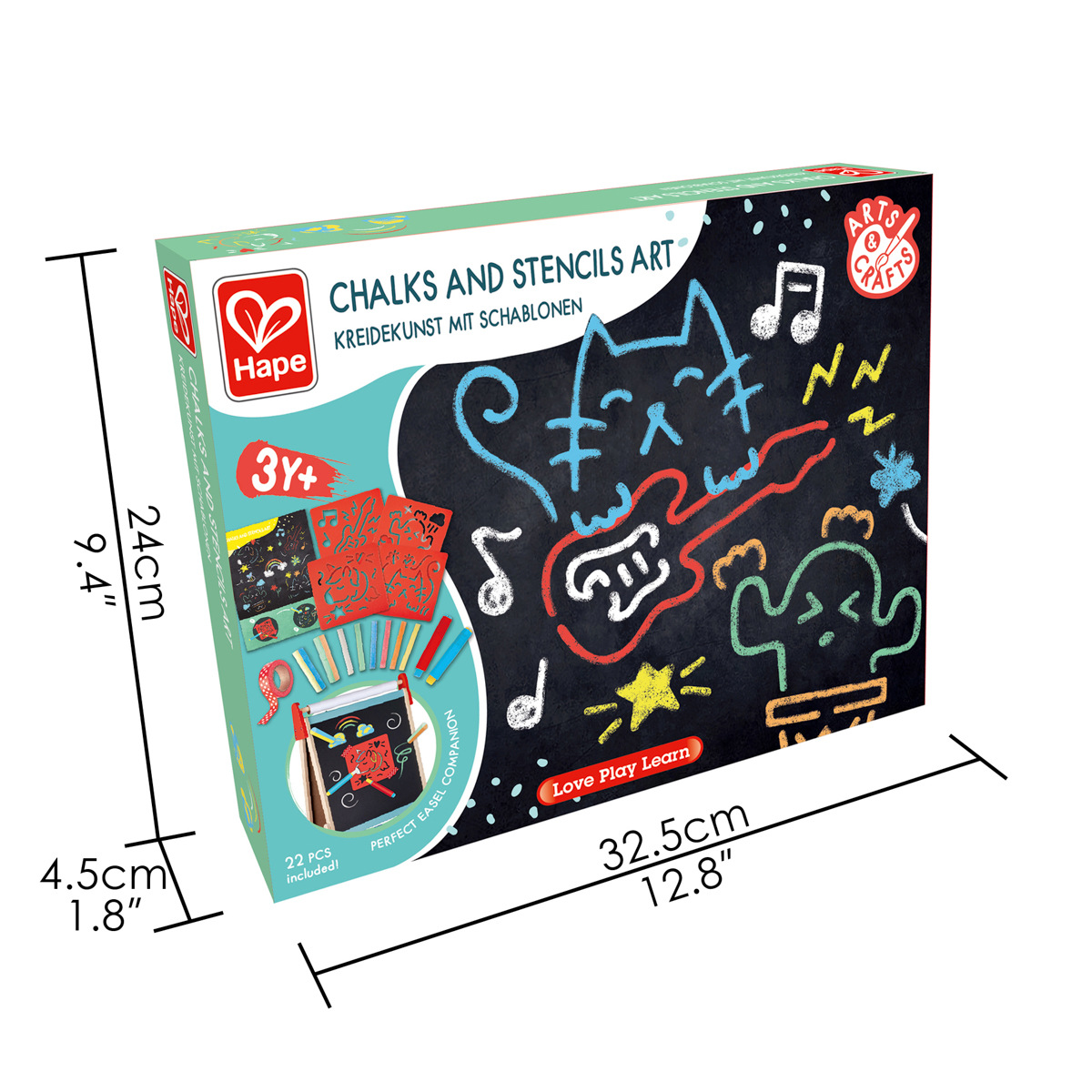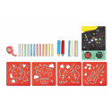 Pomocí šablon a křídy obkreslete vzrušující scény s postavami a funky tvary. Nebo můžete jít od ruky a jednoduše kreslit křídou. Sada obsahuje 12 křídových tyčinek, dva držáky na křídy, dvě dvoubarevné mohutné křídy, čtyři šablony, jednu roli papírové pásky a jeden plakát A4. Držáky křídy pomáhají držet křídy a udržovat prsty čisté. Sbírání, držení a používání kříd pomáhá rozvíjet jemnou motoriku. Kreslení podporuje představivost a kreativní myšlení. Rozměr balení: 34,5x26,2x26 cm. Věk 3+