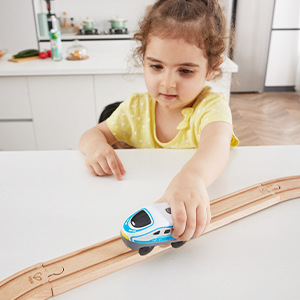 Barevná elektrická lokomotiva k dřevěným vláčkodráhám, která bude sama vozit vagónky po kolejích. Mašinku lze připojit k vagónkům pomocí magnetů. Barevná kombinace a kvalitní zpracování je vhodné pro malé děti. Věk: 18m+. Rozměry: 9 x 4,5 x 3 cm. Rozměr balení: 14,5 x 11 x 5 cm. Baterie: 1x AA (není součástí)