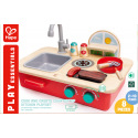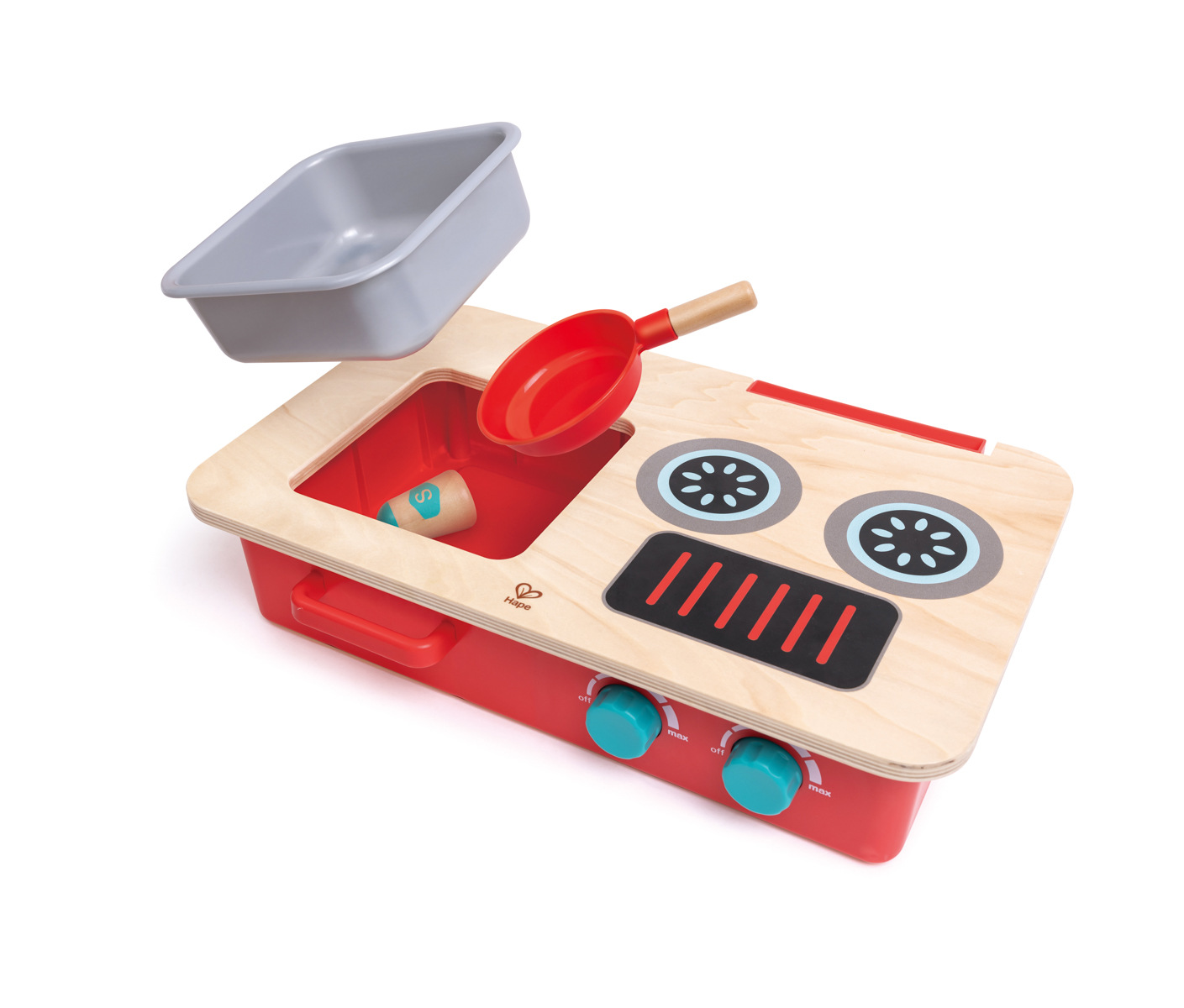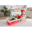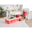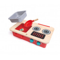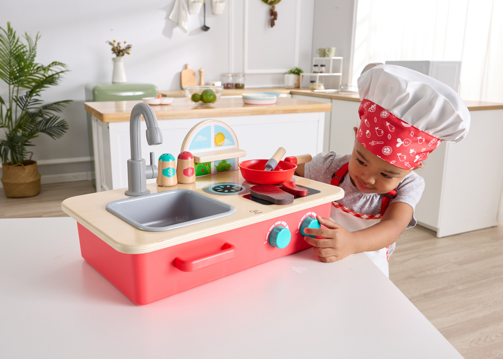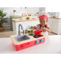 Kuchyňka Cook & Create – stolní sada na vaření. Dřevěná kuchyňská hračka se zvuky, nastavitelným dřezem, tabulí na kreslení a bohatým příslušenstvím k vaření včetně potravin. Ideální pro malé kuchaře a kuchařky, kteří milují hru na vaření a objevování nových chutí. Sada obsahuje kuchyňku se dvěma vařiči, dvě kořenky, dřez s kohoutkem, pánev, obracečku, párek, rybu, plátek masa, talíř, utěrku a poličku na kořenky. Kuchyňku lze jednoduše postavit na podlahu nebo stůl. Při zapnutí kuchyňky se spustí startovací melodie. Položte pánev na plotýnku a otočte knoflíkem – ozve se bublání a prskání. V dřezu s odnímatelným a otočným kohoutkem si děti mohou vyzkoušet mytí nádobí. Hračka skvěle podporuje rozvoj jemné motoriky, jazykových a organizačních dovedností, a hlavně rozvíjí fantazii a hru na role. Kuchyňka je vyrobena z pevného dřeva s kvalitní povrchovou úpravou bezpečnou pro děti. Baterie: 2 x AA, nejsou součástí. Rozměry balení: 30,3 x 46,2 x 11,7 cm. Věk: 2+