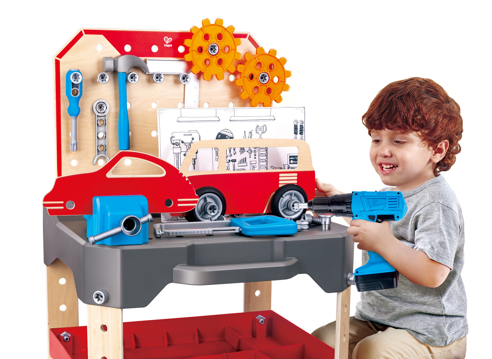 O tom sní malí řemeslníci: vlastní pracovní stůl se skvělým příslušenstvím! Rozsáhlá sada hraček obsahuje mnoho užitečných nástrojů, které lze pohodlně uložit a uložit do pracovního stolu. Sada obsahuje pracovní stůl, kladivo, elektrickou vrtačku (2xAA baterie nejsou součástí), pilu, svěrák, dva převody, čtyřhran, klíč, šroubovák, svinovací metr, čtyři kola, dvě karoserie, kartonovou dekoraci a matice a šrouby. Výšku lavice lze přizpůsobit velikosti dětí podle jejich věku. Balení: 16x40x45cm. Věk: 3+