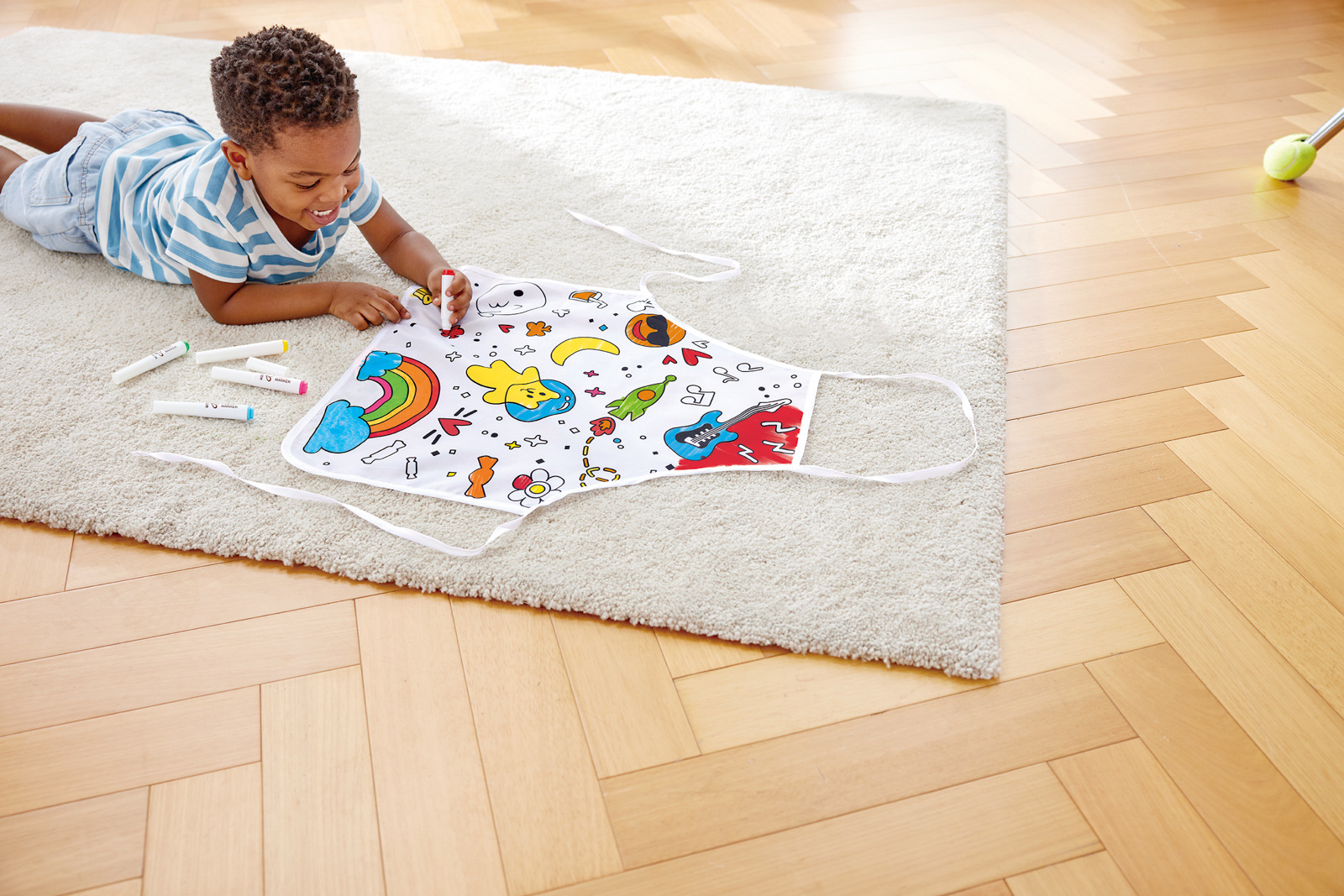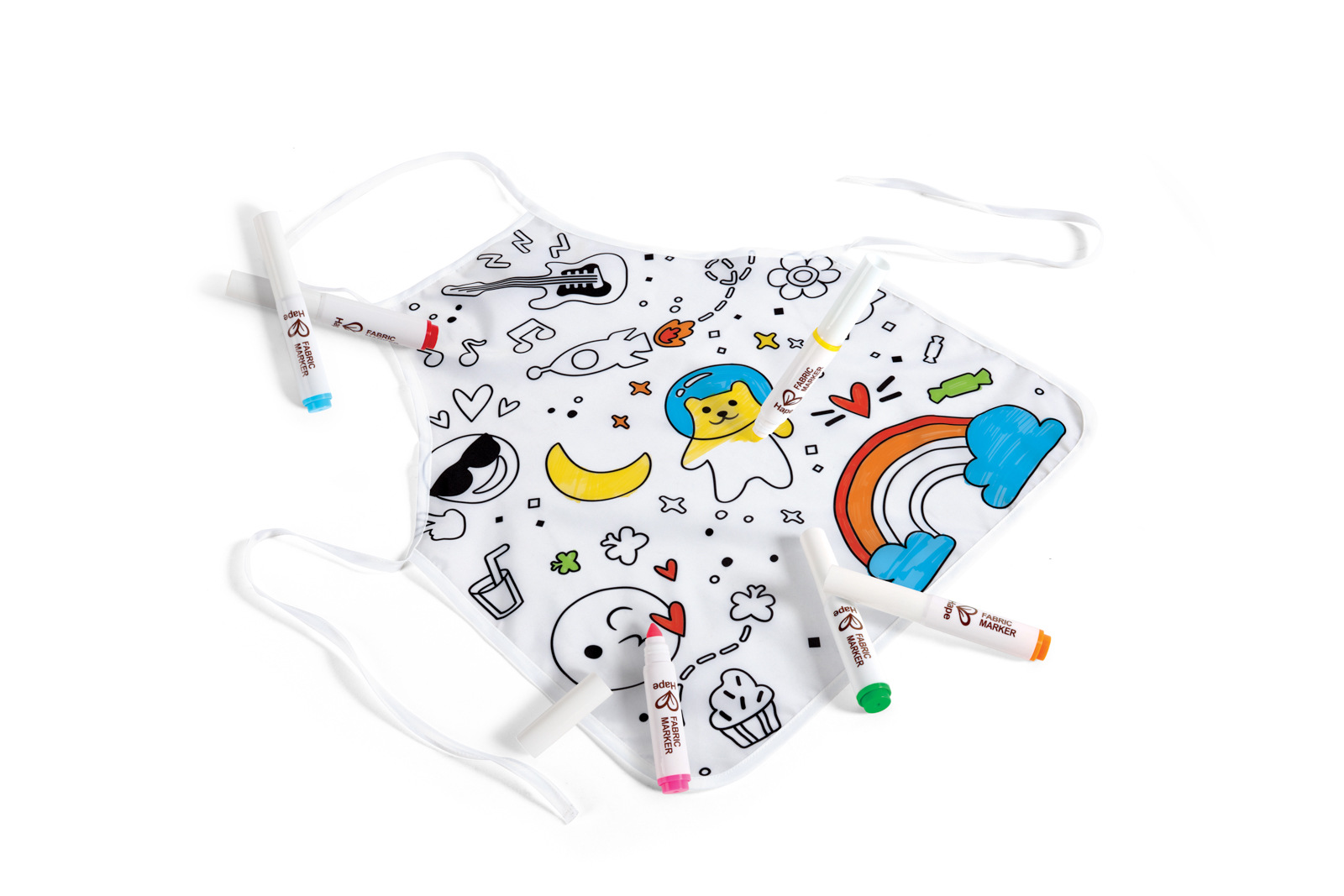 Vytvořte si svou vlastní mistrovskou zástěru, kterou budete používat znovu a znovu, když je čas na kreativitu. Díky zábavným, dětem přátelským designům – jako jsou duhy, raketové lodě a noty – mohou děti vymýšlet své vlastní příběhy a zároveň doplňovat tvary svými oblíbenými barvami. Tato zástěra je dodávána se sadou šesti fixů: zelená, červená, žlutá, oranžová, modrá a černá. Zástěra je voděodolná, aby chránila umělecká díla vašeho dítěte před šmouhami a politím. Rozměr balení: 20x3x12 cm. Věk 3+