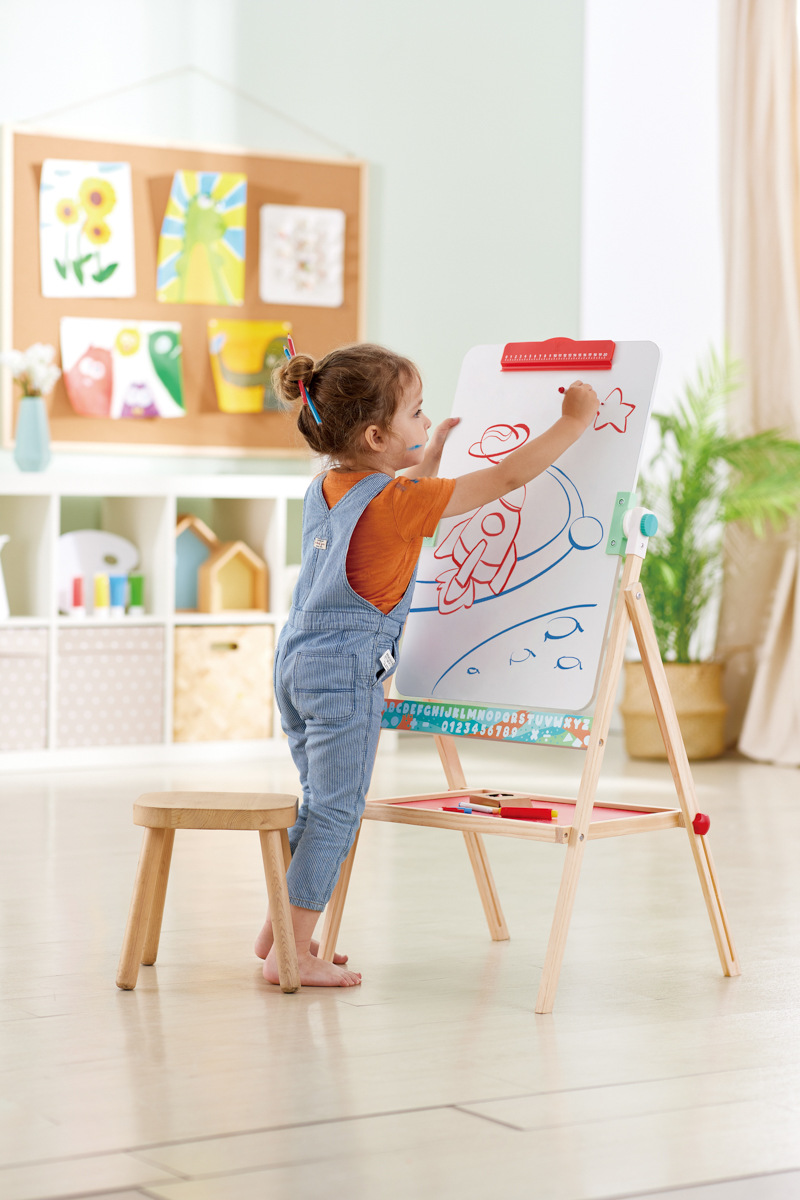 Tato dřevěná tabule je oboustranná. Jedna strana je bílá pro psaní suchými fixy a druhá černá pro klasické křídy. Bílá strana je vyrobena z kovového plechu, takže na ní drží magnetky. Plocha na kreslení má rozměry 30 x 35 cm a celková výška tabule je 65 cm. | Věk: 3+ | Rozměry: 41 x 65 x 33 cm