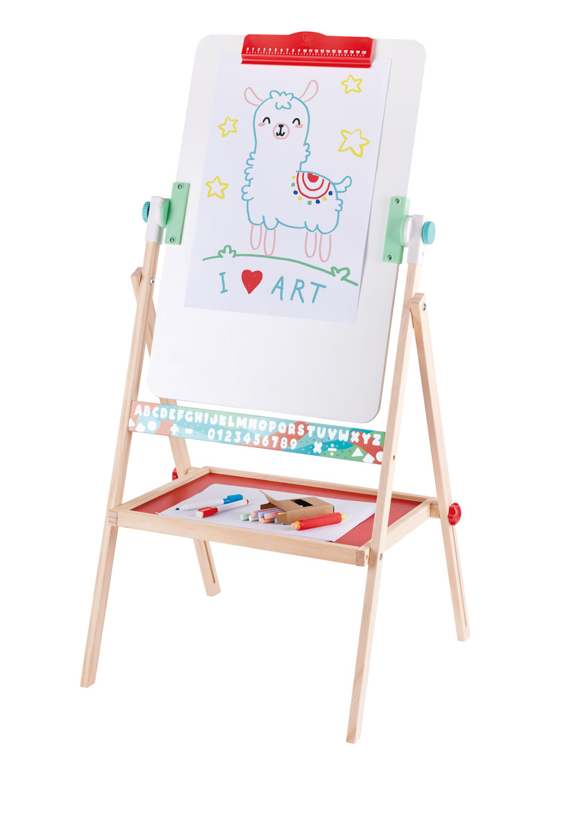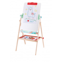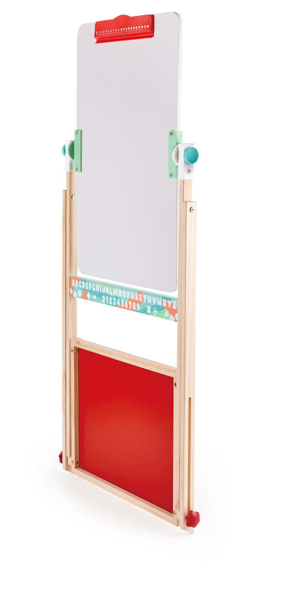 Oboustranná tabule s nastavitelnou výškou. Z jedné strany je zelená plocha pro psaní křídami, z druhé bílá magnetická plocha pro psaní fixou. Nad tabulí je do konstrukce zabudovaná tyčka pro upevnění role papíru, který lze odvíjet a malovat na ploše, kterou poskytují desky tabulí. Obsahuje magnetická písmena, bílé křídy, fix, houbičku a kelímky na vodu a barvy. Obsahuje: 31 dílků. Rozměr: 59 x 57 x výška 111-129 cm. Spodní hrana kreslící plochy: 60-77cm. Rozměr balení: 56,5 x 9 x 71,5 cm. Věk: 3+