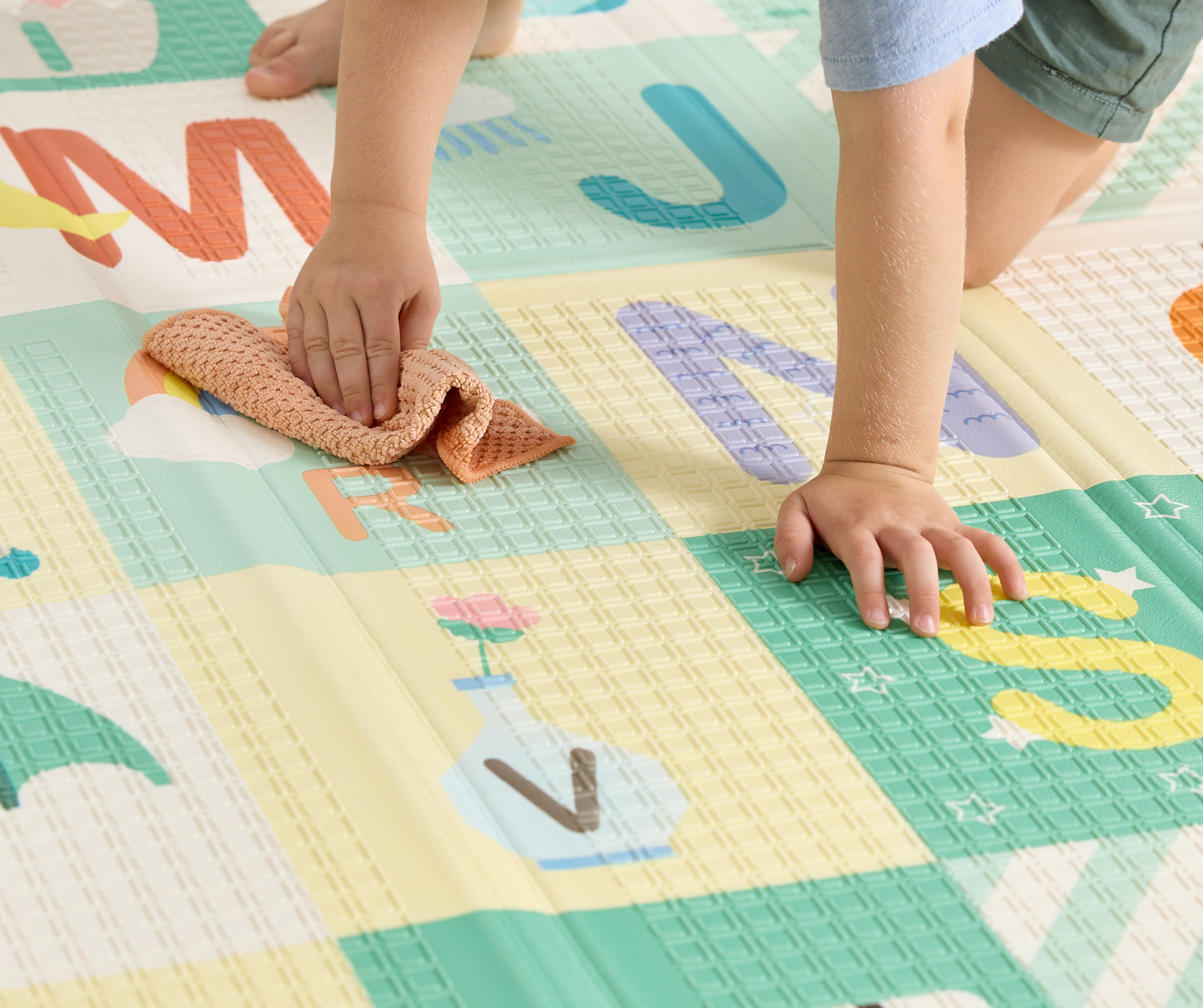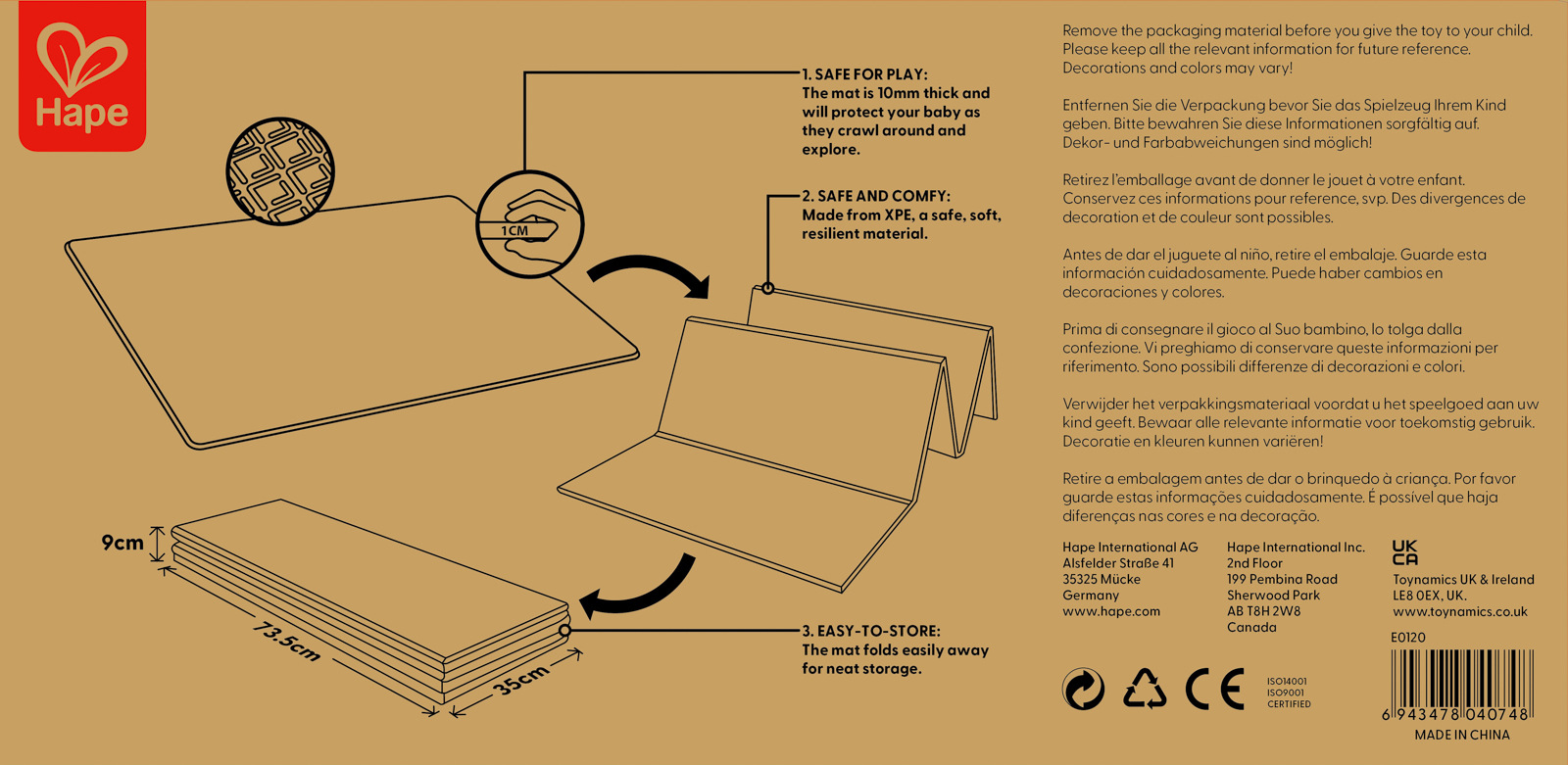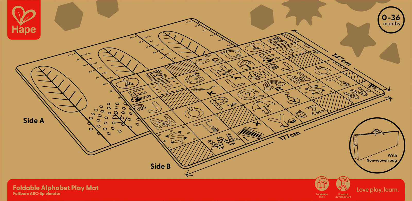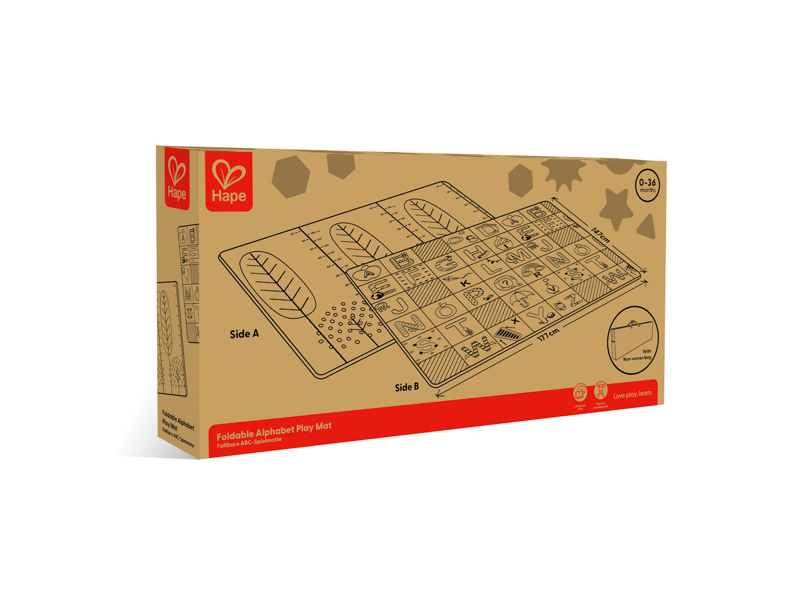 Skládací podložka s abecedou Hape je ideálním místem pro nejrůznější aktivity. Ideální prostor na hraní pro vaše miminka a batolata. Tato pohodlná a bezpečná podložka na hraní nabízí velký otevřený prostor, kde si děti mohou hrát, lézt nebo odpočívat. Na jedné straně podložky jsou barevně vyobrazeny písmena abecedy a na druhé straně dětská stupnice pro měření výšky. Podložka je voděodolná a snadno se otírá od rozlitých tekutin a nečistot. Podložku lze snadno složit a úhledně uložit. Rozměry rozložené podložky: 147 x 177 x 1 cm. Rozměry složené podložky: 73,5 x 35 x 9 cm. Rozměry balení: 36,5 x 75 x 11 cm. Doporučený věk: 0-36 měsíců.