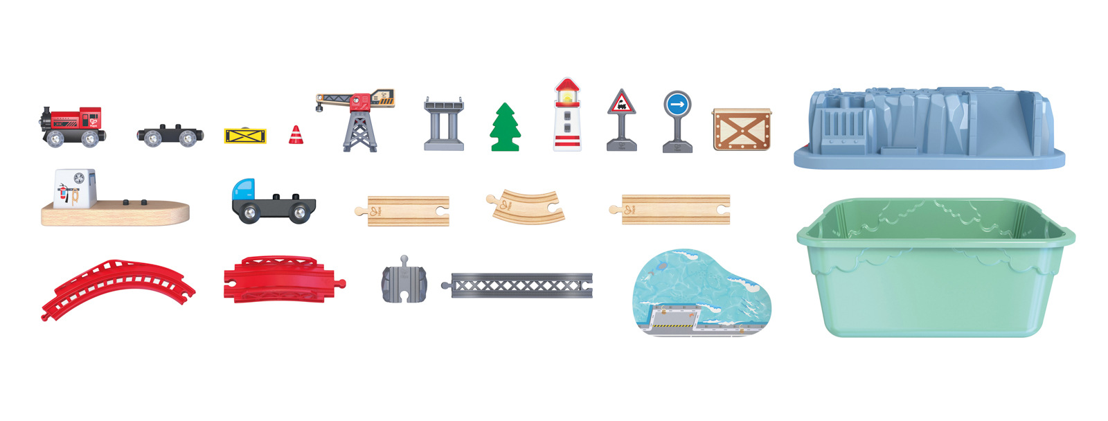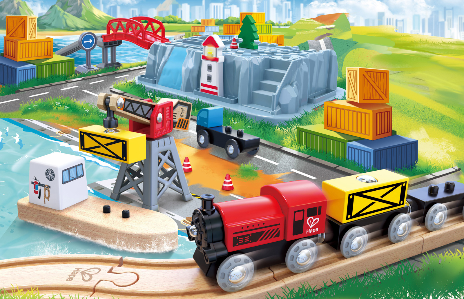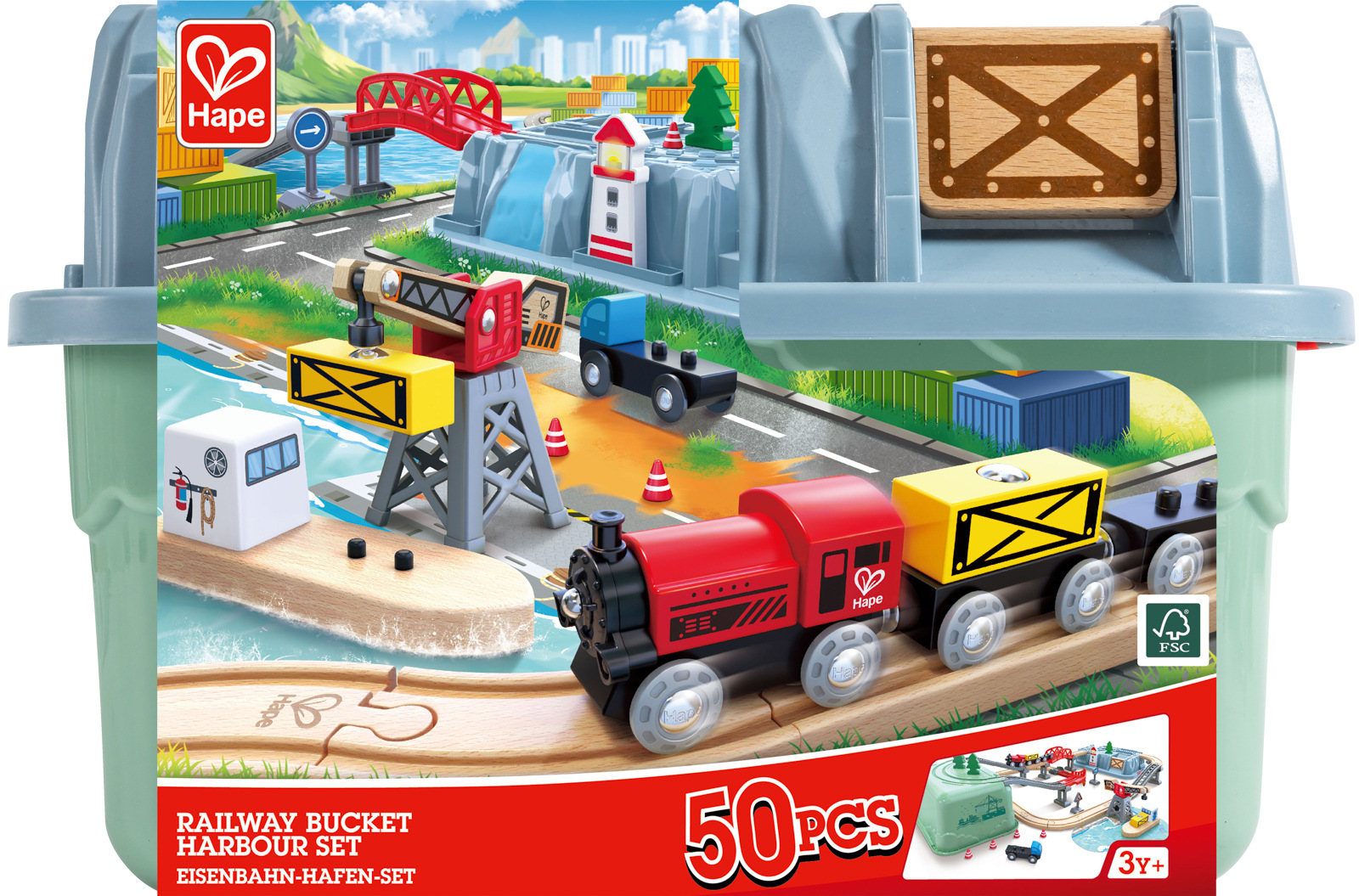 Je čas vyložit náklad, který cestoval přes moře. S touto krásnou vláčkodráhou si vaše ratolest užije dobrodružství, které se děje v přístavu. Pomocí jeřábu naloží důležitý náklad z lodi do vlaku a zpět. Po hře lze díly uložit do boxu, který se po otočení vzhůru nohama stane součástí herní scenérie. Sada rozvíjí fantazii, sociální dovednosti i spolupráci, při stavění tratě učí samostatnosti. Vlak, vagony a kolejnice v sadě jsou kompatibilní se všemi lokomotivami, příslušenstvím a vláčkovými sadami Hape. Vyrobeno z kvalitních, hypoalergenních materiálů. Sada obsahuje: Lokomotivu Tap & Go, vagónky, kolejnice, jeřáb, přístaviště s lodí, most a další doplňky. Počet dílků: 50 ks. Rozměry balení: 23,5 x 32 x 21,5 cm. Věk: 3+