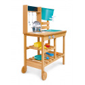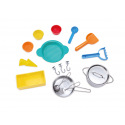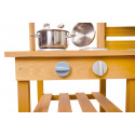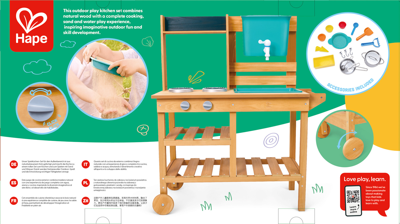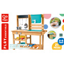 Objevte kouzlo vaření pod širým nebem! Tato dřevěná venkovní kuchyňka je dokonalou kombinací hry, objevování a tvořivosti. Děti mohou míchat, přelévat, sít i vařit „speciality“ z písku, vody a přírodnin – ideální hračka pro malé objevitele. Přitom si procvičují jemnou motoriku, fantazii i spolupráci s ostatními. Sada obsahuje 21 dílů: robustní dřevěná kuchyňka na kolečkách, odnímatelný dřez s kohoutkem, pracovní miska, hrnec s pokličkou, pánev, cedník, naběračka, vařečka, špachtle, 4 barevné kelímky, 2 lopatičky, hrabičky a formička na písek. Díky pevnému FSC dřevu a bezpečným materiálům je připravena na každodenní dobrodružství na zahradě. Rozměry balení: 42,5 x 74 x 21,5 cm. Doporučený věk: od 3 do 8 let.