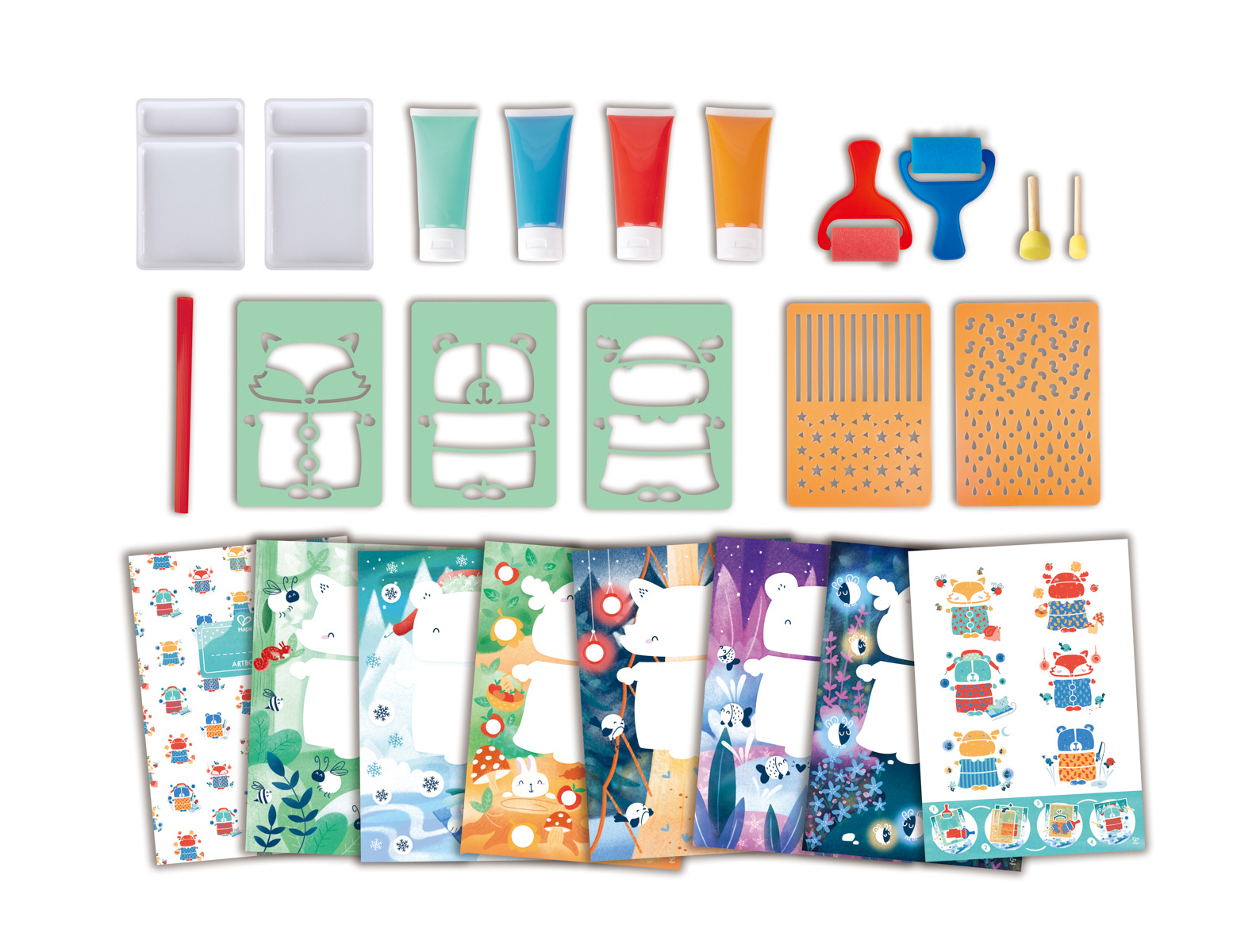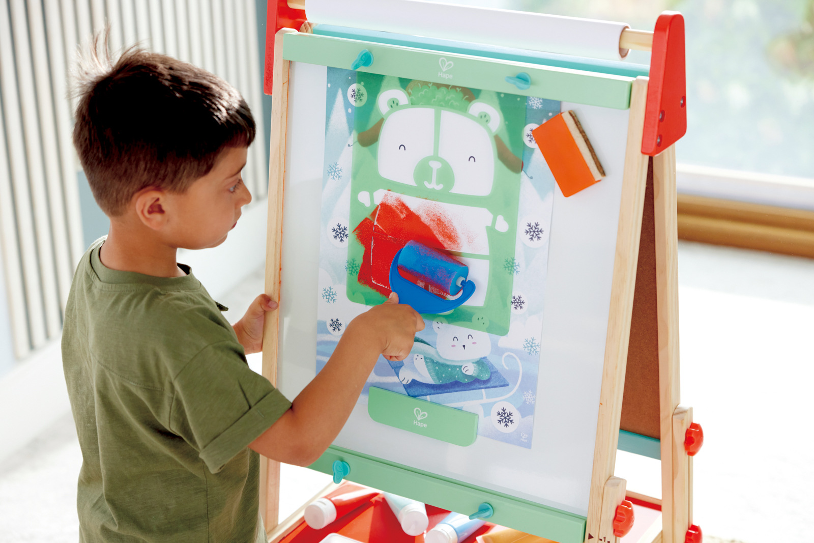 Zábavné malování houbičkou od Hape. Malujte a navrhujte své vlastní postavy s touto inspirativní sadou šablon. Můžete si dokonce vybrat ilustraci z alba jako pozadí, takže každé umělecké dílo, které vytvoříte, je jedinečné! Sada obsahuje čtyři tuby s barvami o objemu 60 ml v různých barvách, pět šablon A4, dva malířské válečky, dvě kulaté houbičky na tyčkách a jedno 8stránkové album formátu A3 se 6 aktivitami. Malování je skvělé pro povzbuzení kreativního myšlení a představivosti zároveň podporuje jemnou motoriku. Tuto sadu lze použít spolu se stojanem Hape pro extra umělecký nádech. Rozměr balení: 32,5x24x4,5 cm. Věk 3+