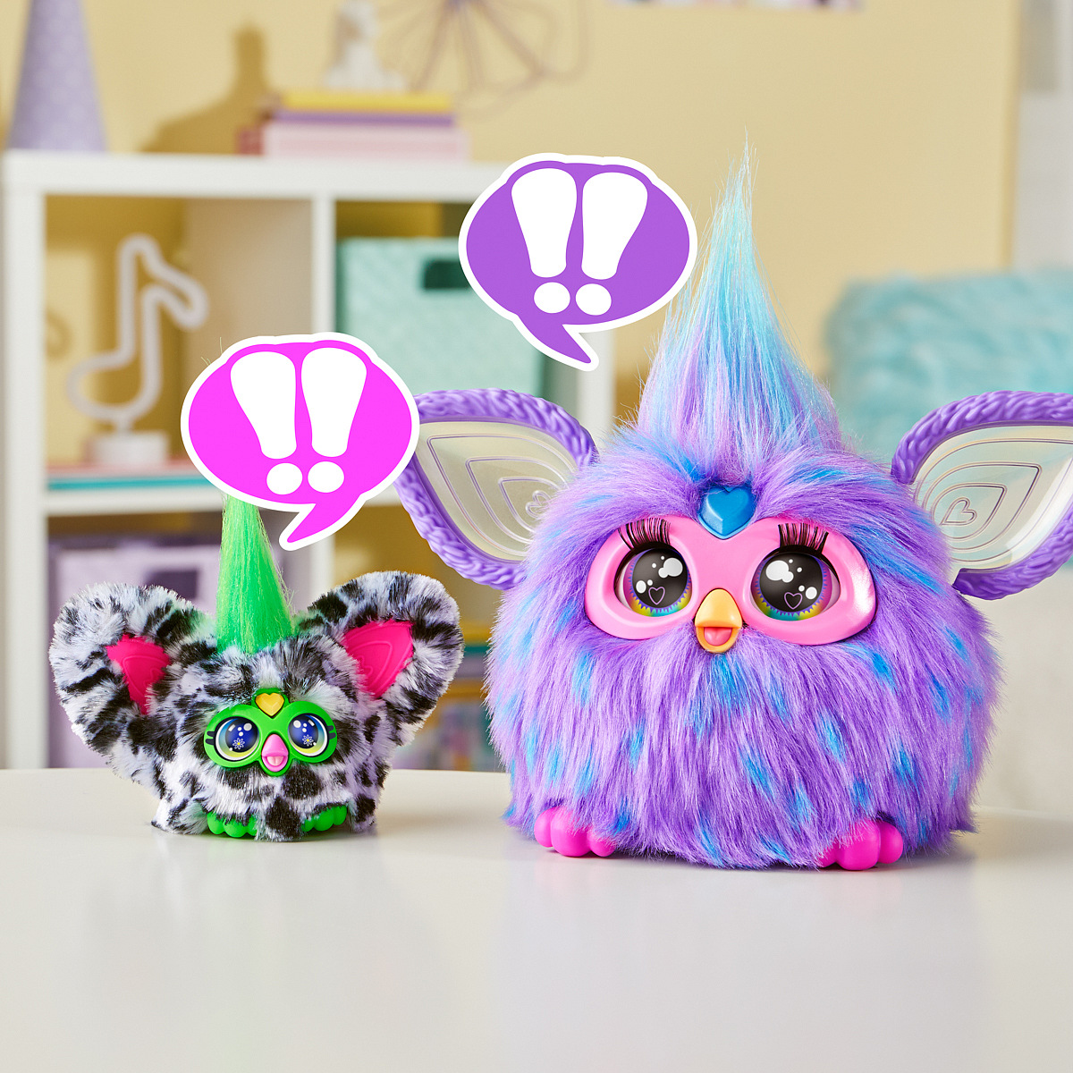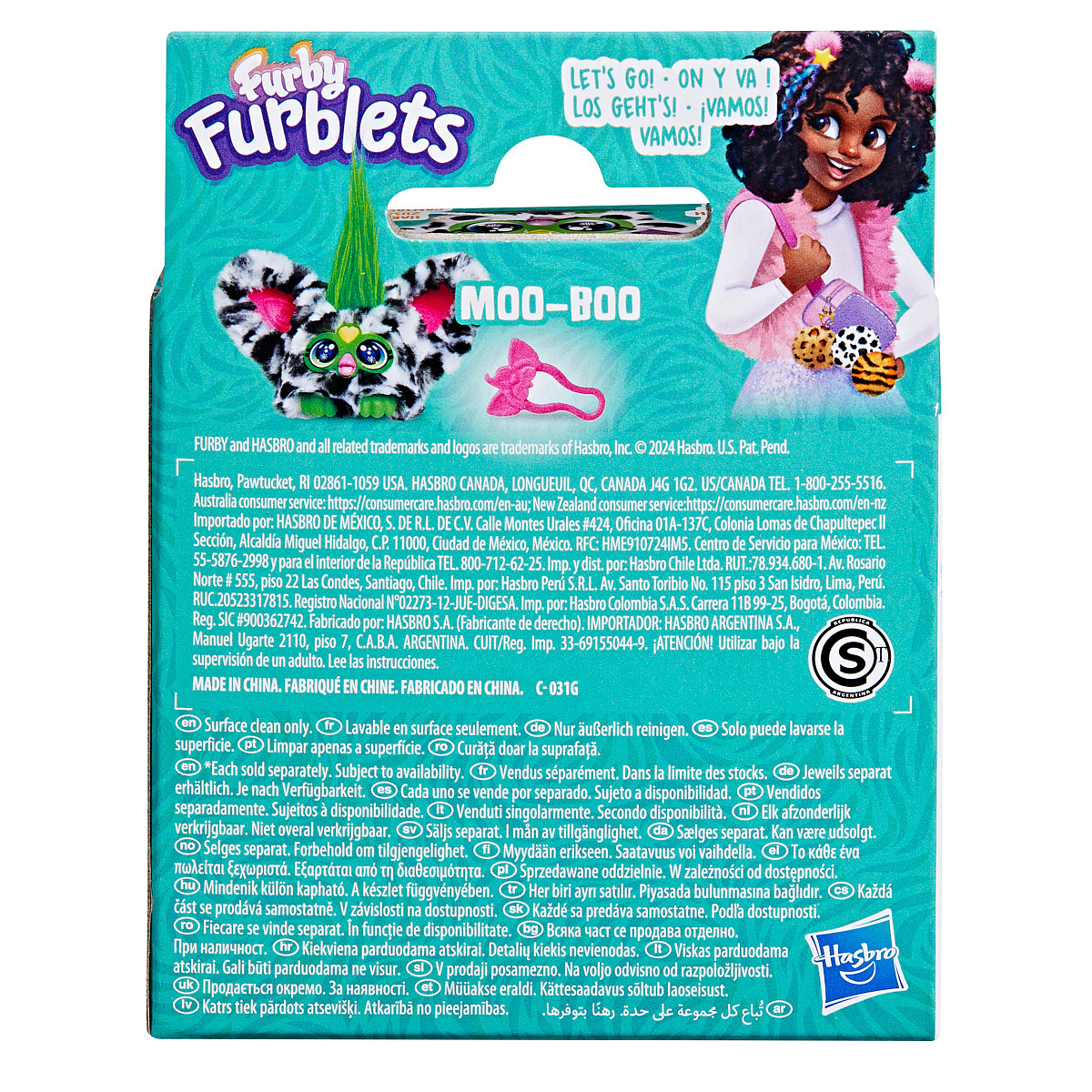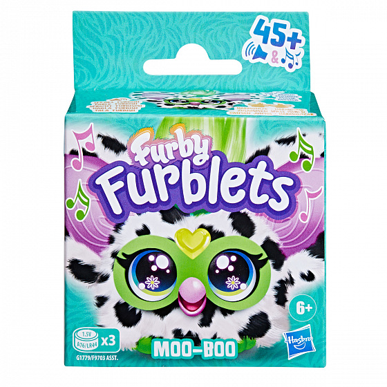 Roztomilý Furby Furblet Moo-Boo vypadá jako malá kravička s velkou osobností. S touto mini interaktivní hračkou můžete objevovat celou řadu zábavných zvukových a hudebních efektů. Furby Furblet Moo-Boo hraje veselou hudbu a říká různé fráze v jedinečném jazyce zvaným Furbish (Furblets neznají lidskou řeč). Stisknutím zobáku se ozvou zábavné zvuky krmení a klepnutím na srdíčkový drahokam se spustí hudba. Stisknutím horní části hlavy se aktivují zábavné fráze v jazyce Furbish a funkce on/off. Furblets jsou v různých barvách a s různými hudebními styly. Nasbírej jich více a nech je zpívat společně. Připněte si Moo-Boo k batohu nebo jiné cestovní tašce pomocí klipu na klíče a vezměte ho na party kamkoli s sebou. Klip je odnímatelný. Funguje na knoflíkové baterie 3 x LR44, které jsou součástí balení. Pokud máte větší interaktivní hračku Furbyho, aktivujte režim Furdar a podívejte se, co Furby říká o svých malých kamarádech Furblets. Elektronická plyšová hračka je vhodná pro dívky a chlapce