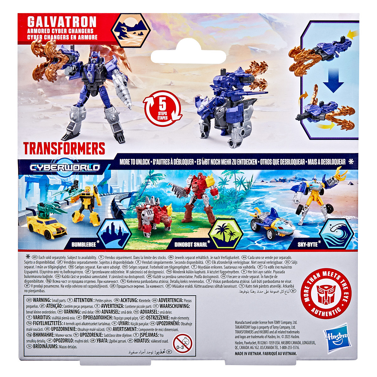 Transformers Cyberworld - Armored Cyber Changers vám přináší známé tváře a nové bojové strategie! Posilte se svými oblíbenými Autoboty a Decepticony, zatímco bojují o galaktickou nadvládu. Akční figurka Galvatron se snadno promění z robota na alternativní mód draka v 5 krocích. Přeměna v 5 krocích je dostatečně jednoduchá, aby ji děti zvládly samy. V režimu robota je figurka vysoká přibližně 10 cm a je polohovatelná. Součástí figurky je blaster, který má dva úžasné režimy a lze jej připevnit k figurce v režimu robota i draka. Vyrobeno z kvalitního plastu. Rozměry balení: 18,1 x 17,7 x 4,9 cm. Věk: 6+