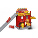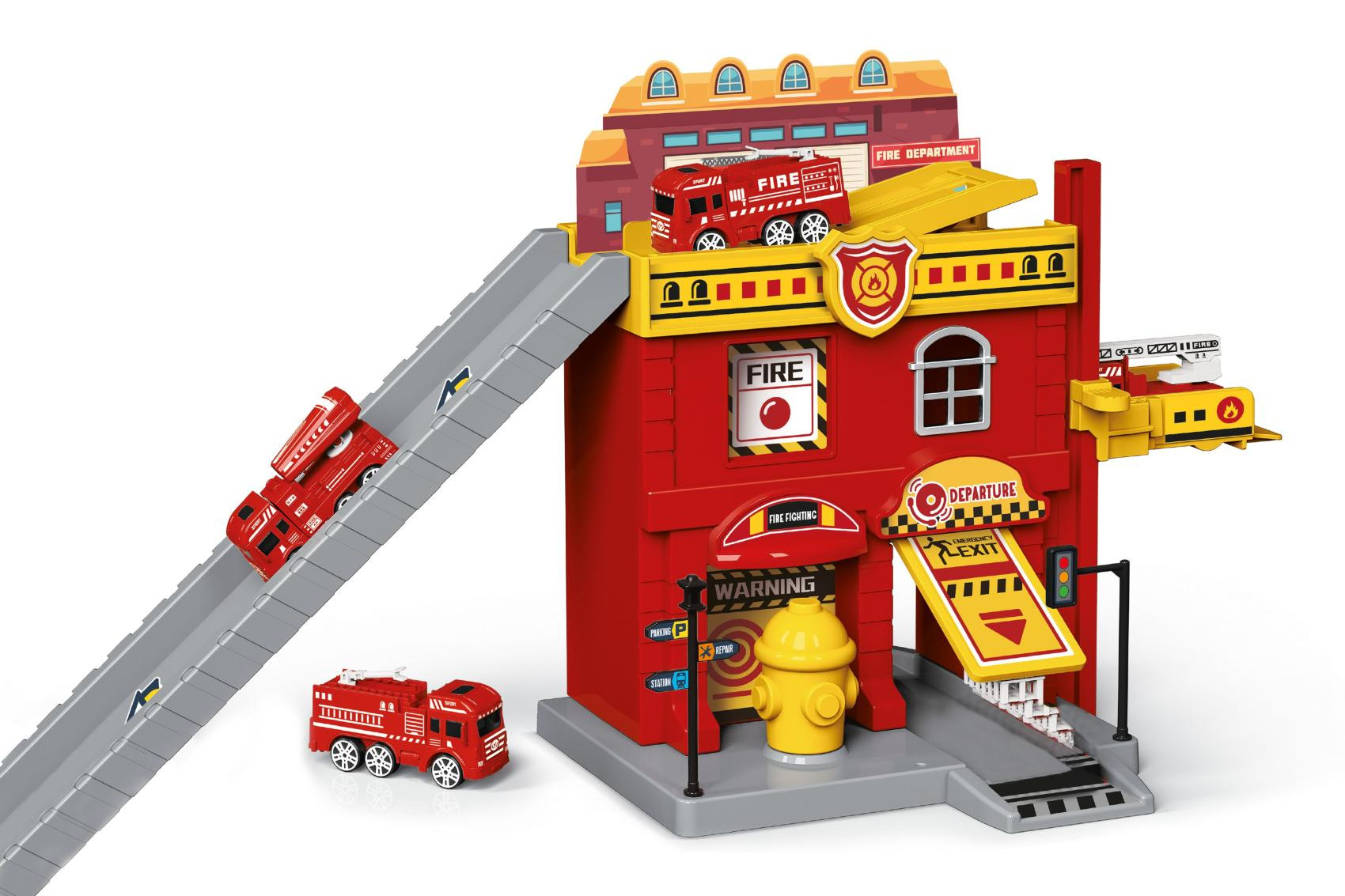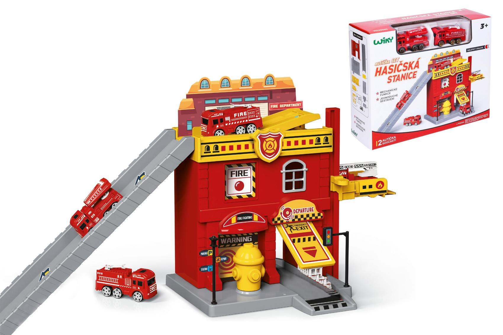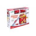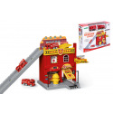 Hasičská stanice. Rozměry 37x17,5x21 cm. Součástí dvě auta. Volná kola. Manuální výtah, otevírací dveře. Nálepky a obrázkový návod na složení součástí balení.