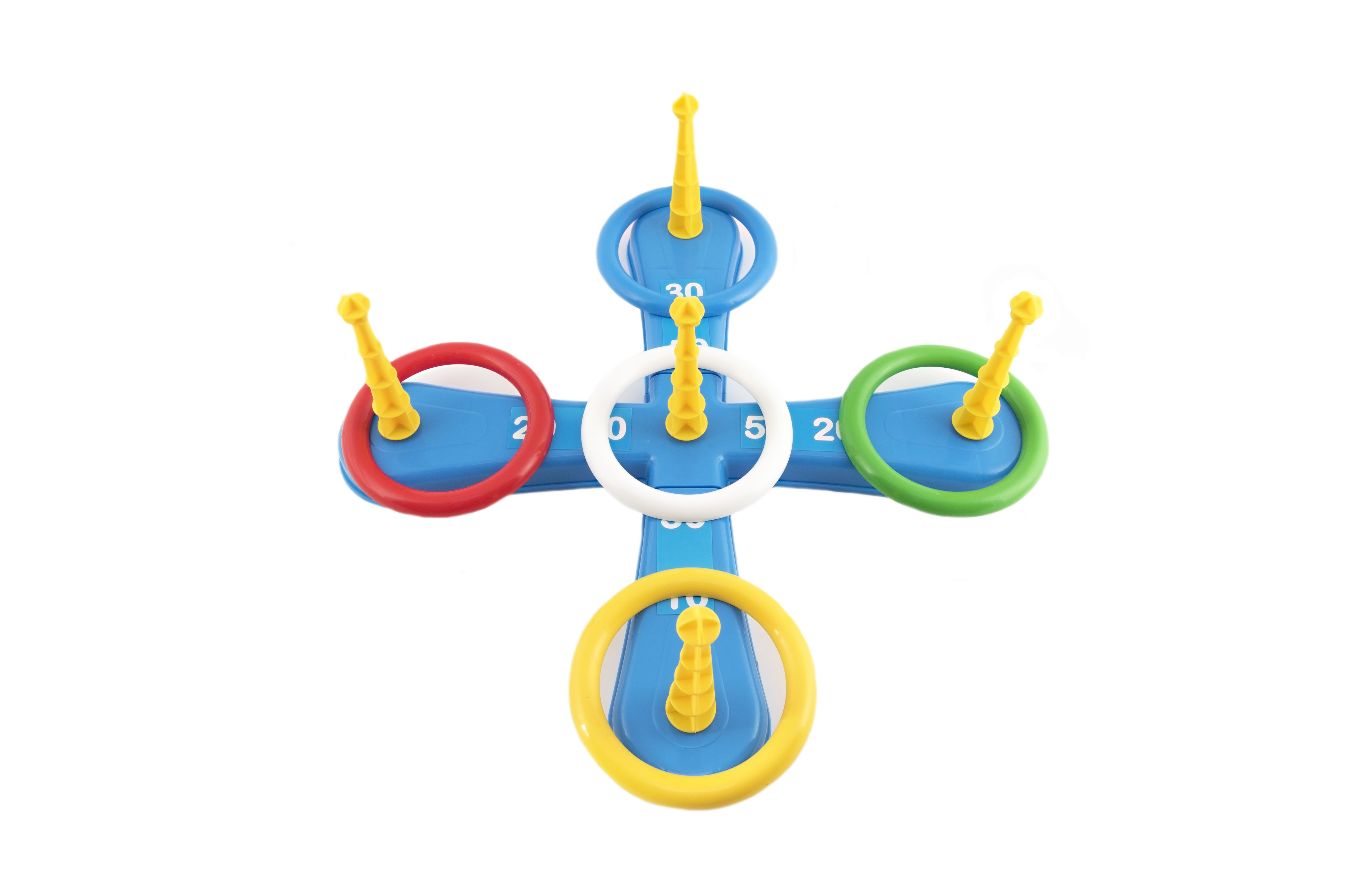 Zábavná hra, při které se hází kroužky na kříž. Balení obsahuje kříž s pěti hroty a pět barevných kr