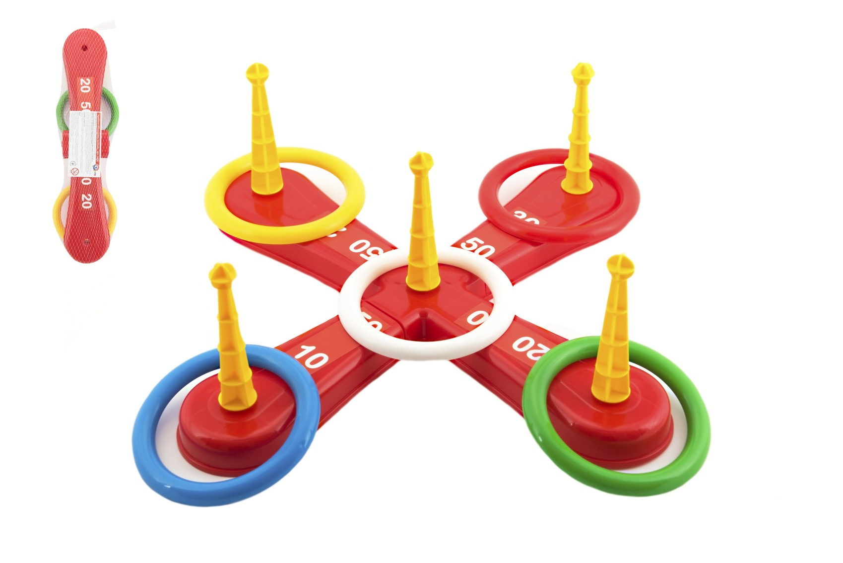 Zábavná hra, při které se hází kroužky na kříž. Balení obsahuje kříž s pěti hroty a pět barevných kroužků. Jednotlivé dílky jsou vyrobené z plastu. Tato hra se bude líbit zejména nejmenším dětem, které mohou sbírat body za každý hod, kdy se jim podaří umístit kroužek na hrot. Natrénují si také přesnost a trpělivost. Vhodné od 3 let.