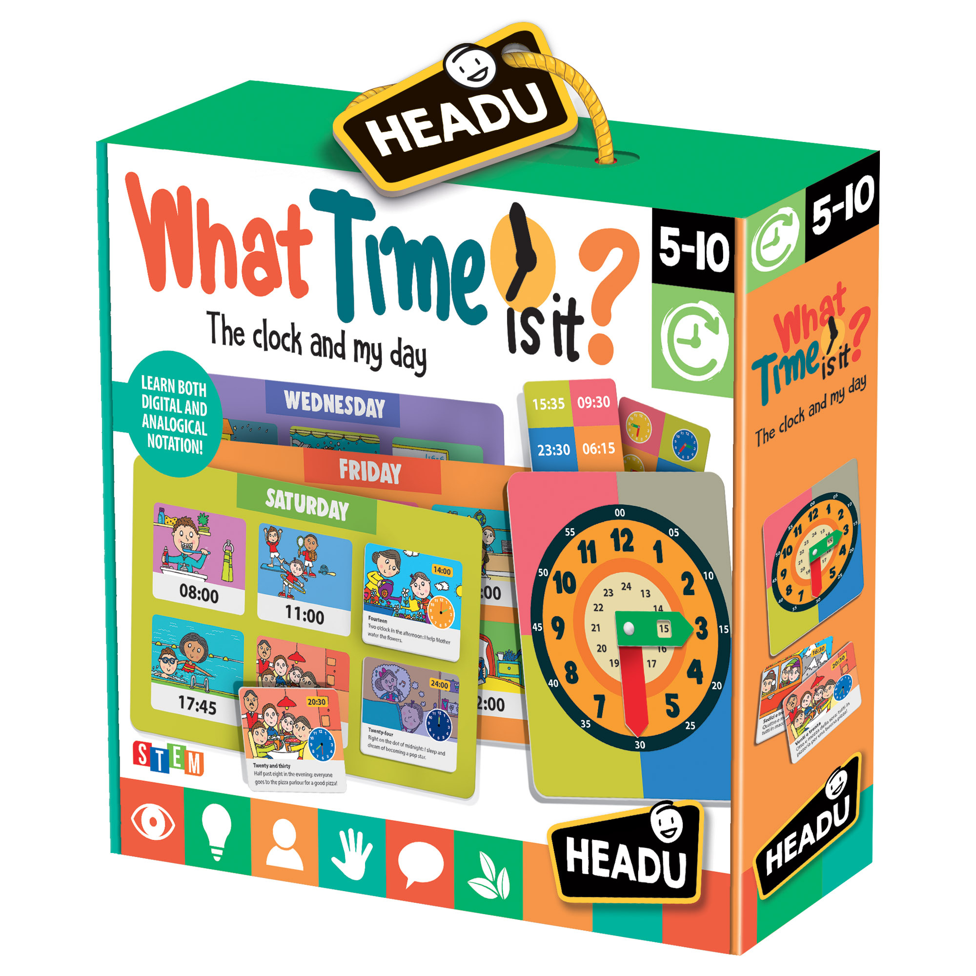 Obsah balení: 1 hodiny s ručičkami, 7 karet „můj den“, 54 karet bingo, 12 karet s hádáním času, 1 herní deska bingo, pravidla hry Doporučený věk: 5-10 let Balení: 28,5 x 25,5 x 6,1 cm