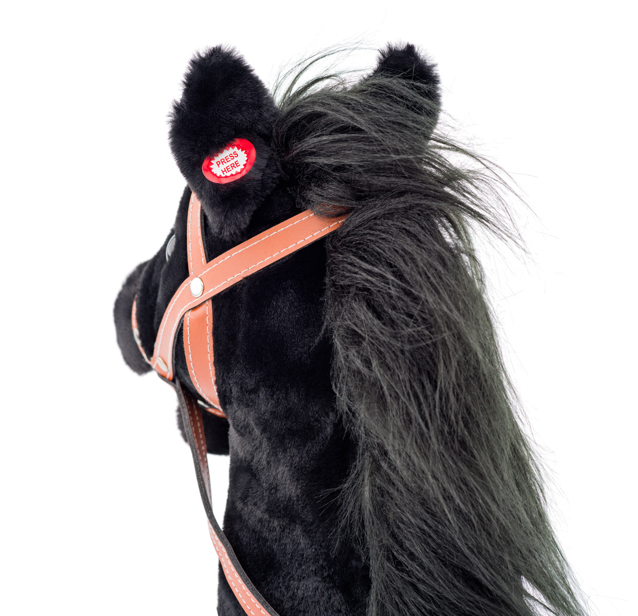 Hobby horsing je ideální volbou pro všechny milovníky koní. Uspořádej s kamarády závod v této speciální disciplíně! Tento černý krasavec má navíc na uchu zabudovaný senzor, který spouší zvuky ržání a cvalu. Je dodáván včetně odnímatelné uzdy s udidlem. Součástí je dřevěná šroubovací tyč (viditelná část: 30 cm). Hlava je vyrobena z polystyrénového materiálu obaleného měkkým kvalitním plyšem.| Věk: 3+| Rozměr komplet výrobku: 65 cm, 4.5V- 3 X LR 44 baterie jsou součástí .