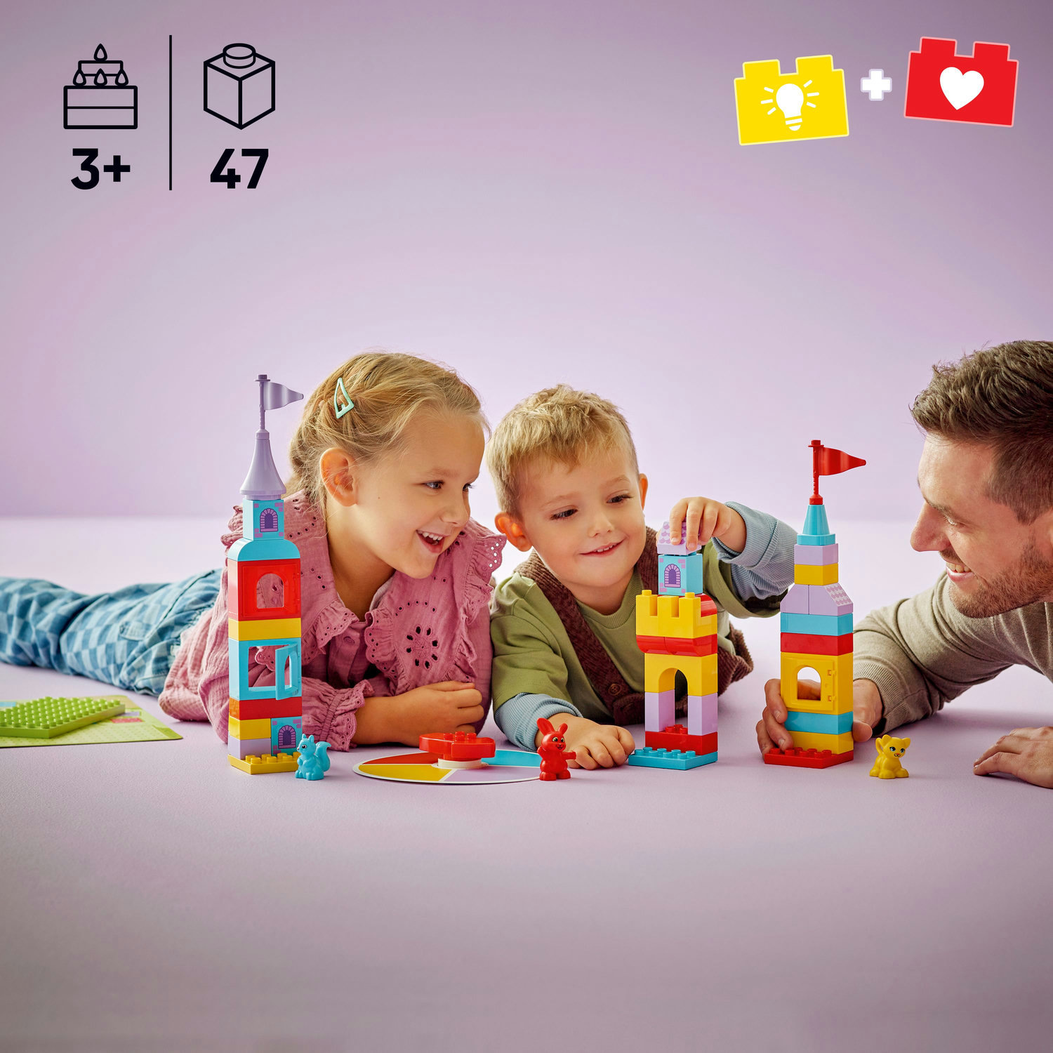 Užijte si se svou ratolestí hodiny rodinné zábavy a pomozte jí učit se hrou se stavebnicí 2 v 1 LEGO® DUPLO® (10450) Hopsy a hra s hradem. Děti se vydají na vzdělávací dobrodružství LEGO DUPLO a procvičí si počítání a třídění barev během hraní jedné ze dvou zábavných her. Děti se naučí poznávat barvy a čísla během kreativního stavění modelu hradu. Tato zábavná rodinná aktivita začíná tím, že si každý hráč vybere zvířátko a poté roztočí šipku, aby zjistil, o kolik míst na hrací ploše se může posunout. Do modelu pak přidá jednu kostku v té barvě, na které přistál. Hra končí, když všechny postavy dorazí na hrad. Ve druhé hře děti třídí barvy, aby zjistily, kdo dokáže postavit nejvyšší věž. Každý hráč roztočí šipku a zjistí, jakou barvu kostky může přidat do svého modelu. S touto vzdělávací stavebnicí si děti procvičí řadu dovedností, jako je střídání během hry, představivost a používání jemných motorických schopností během kreativního stavění nebo spolupráce s týmem během stavění hradu. Obsahuje 47 dílků.