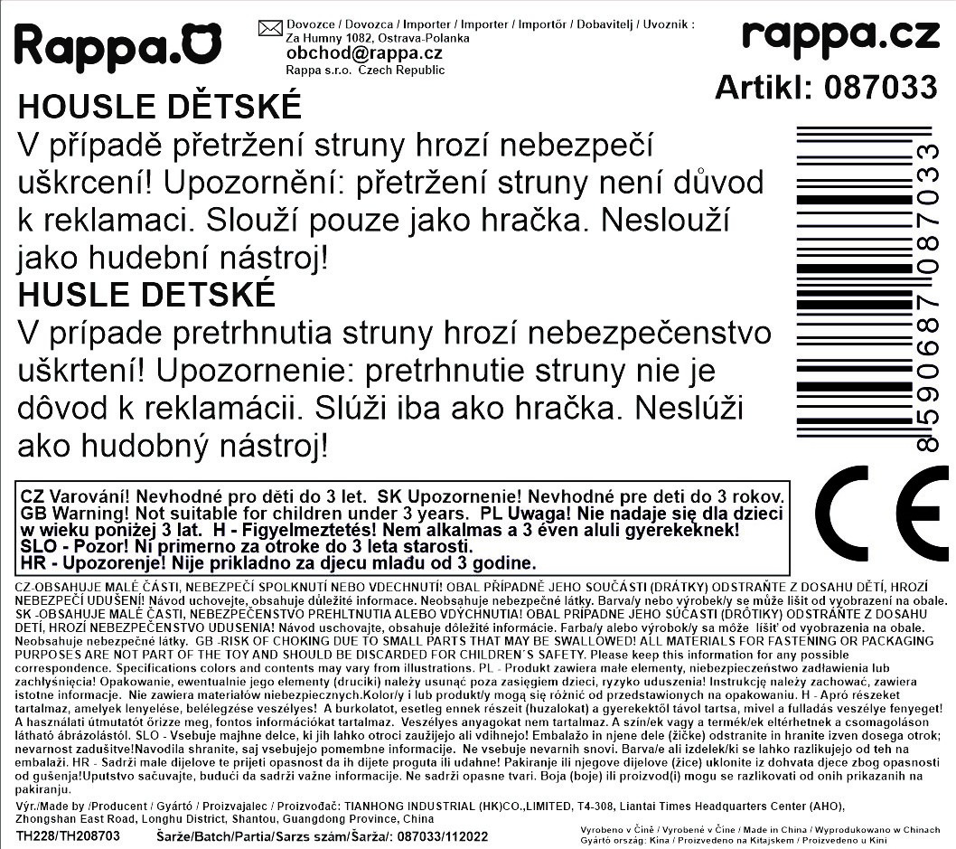 Plastové housle se smyčcem, pouze hračka. Vše je uloženo v krabici s praktickým úchytem. Doporučeno