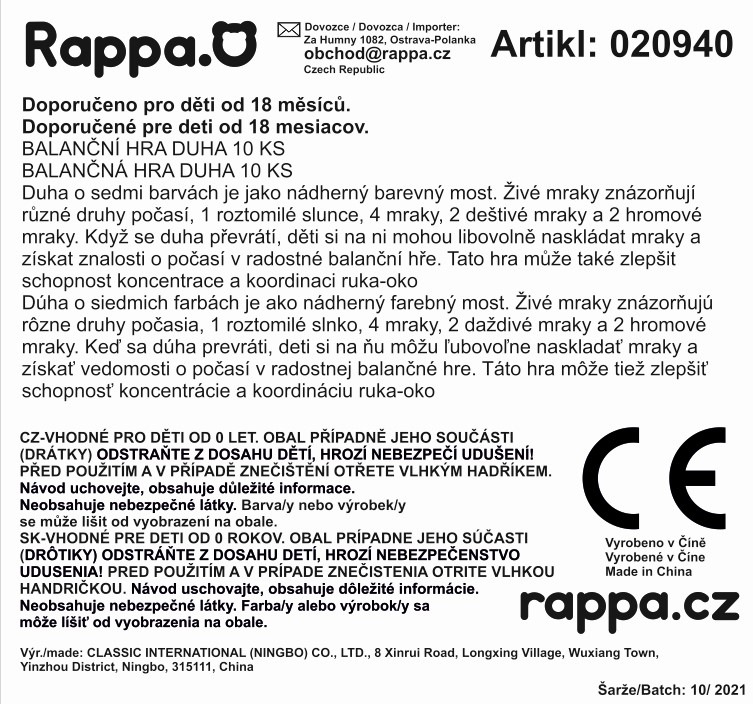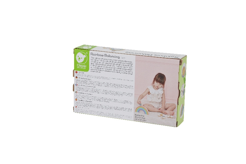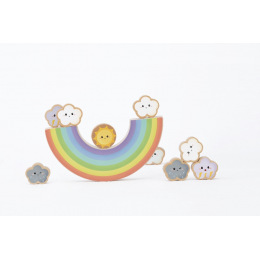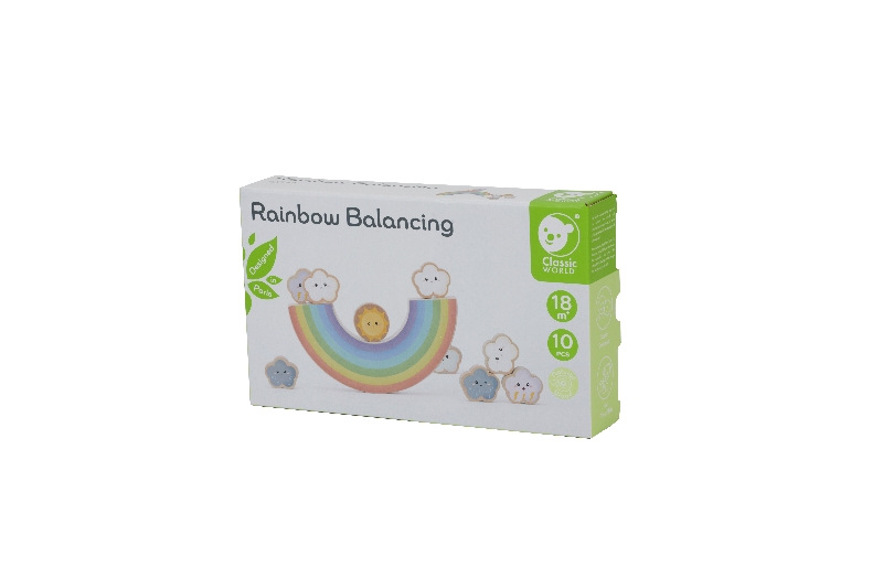 Duha o sedmi barvách je jako nádherný barevný most. Živé mraky znázorňují různé druhy počasí, 1 roztomilé slunce, 4 mraky, 2 deštivé mraky a 2 hromové mraky. Když se duha převrátí, děti si na ni mohou libovolně naskládat mraky a získat znalosti o počasí v radostné balanční hře. Tato hra může také zlepšit schopnost koncentrace a koordinaci ruka-oko