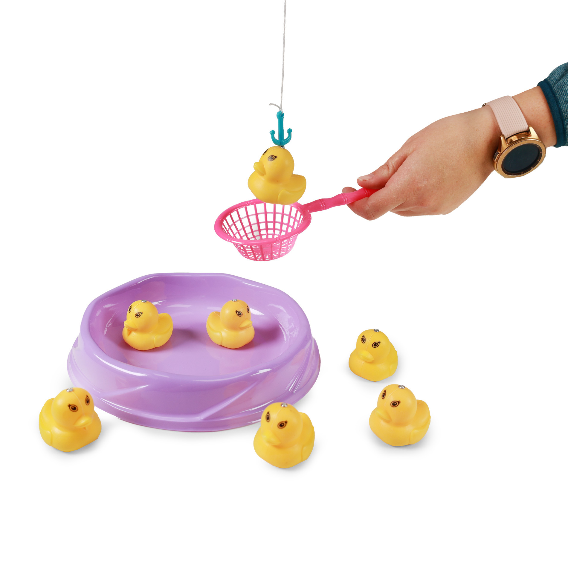 Zábavná hra pro malé rybáře! Tento praktický set obsahuje 1 prut s háčkem, plastové mini jezírko a 6 kačenek s magnetky. Nádobu naplň vodou, vlož kačenky do vody, připrav si prut a můžeš začít! Díky prutu opatřeným magnetem, pro tebe nebude lovení kačenek žádný problém!