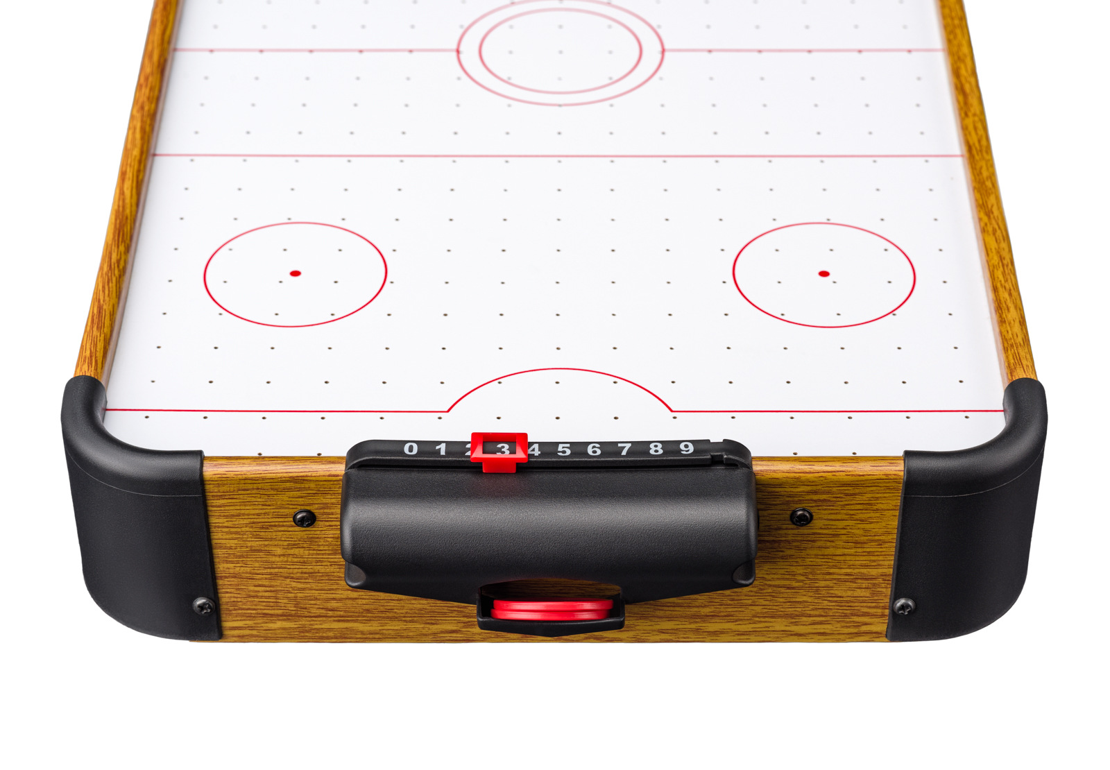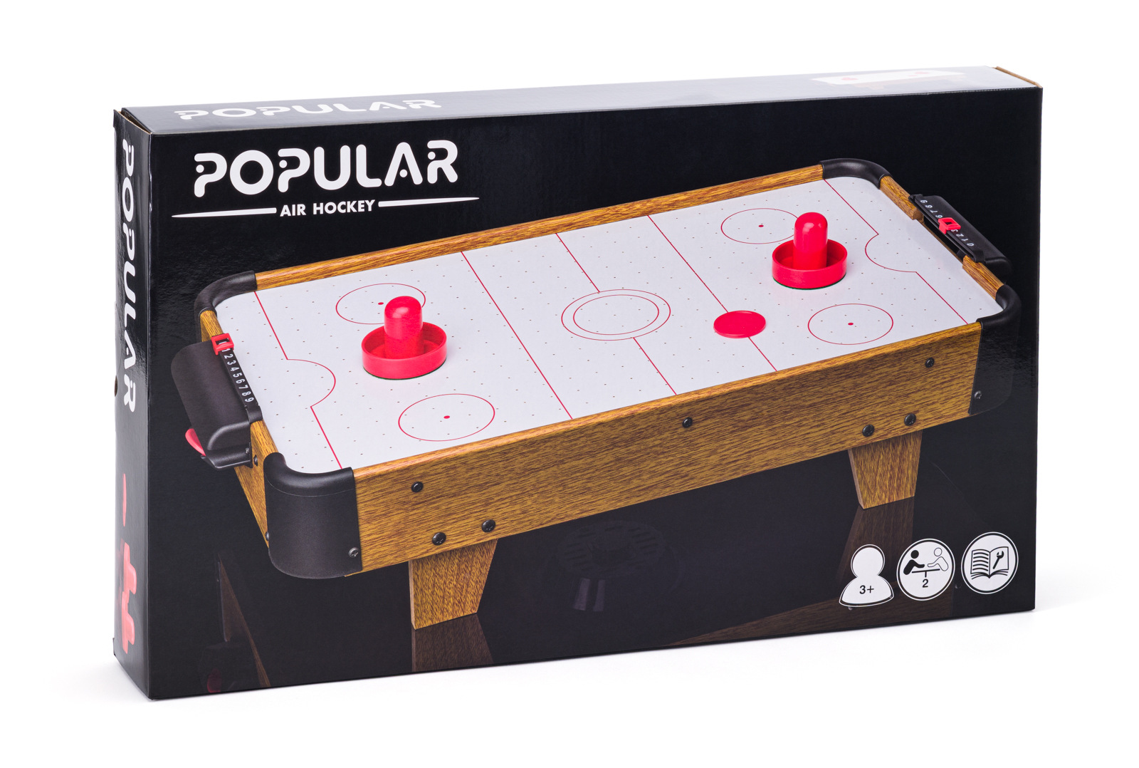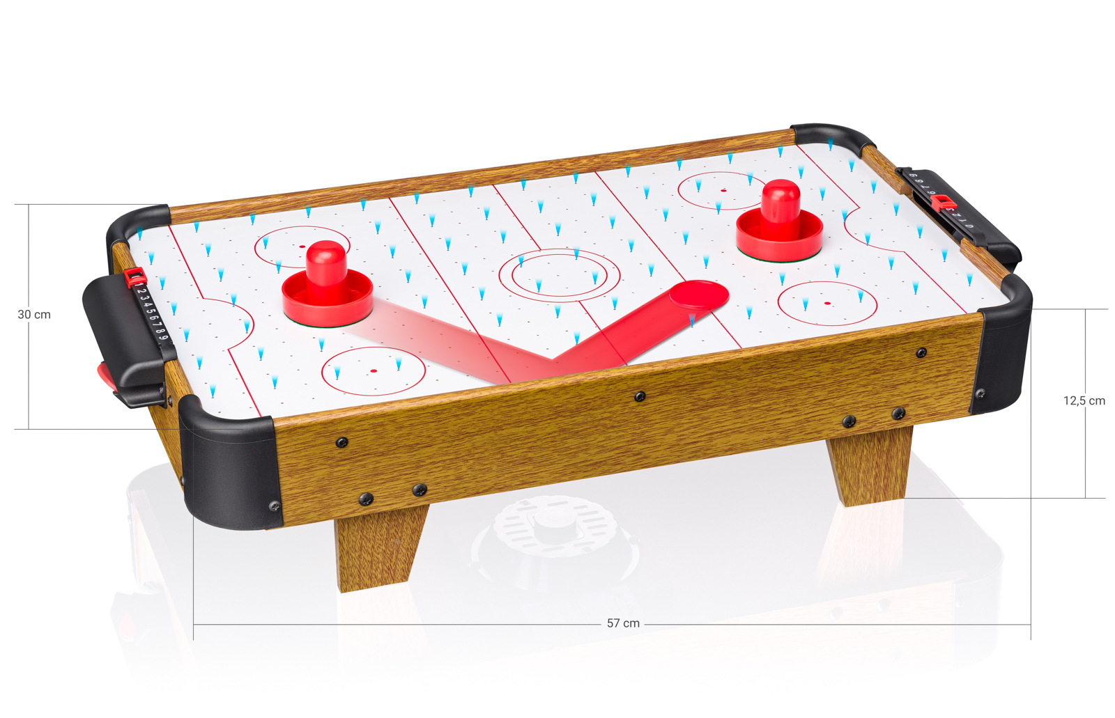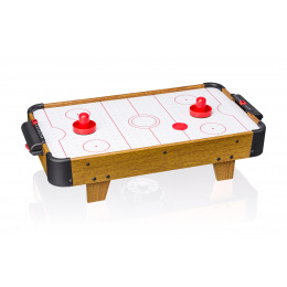 Prověří postřeh a hbitost hráčů. Díky vzduchu vháněnému zespodu vestavěným ventilátorem může puk hladce, ale hlavně bleskurychle klouzat po hrací ploše. Hráči mají k dispozici speciální pálky, kterými se snaží vstřelit puk do soupeřovy branky. Pálky jsou ve spodu opatřeny plstí pro snadný a bezhlučný pohyb. Rychlá akční hra pro 2 hráče. Baterie: 3 x AA (nejsou součástí). | Věk. 3+ | Rozměr: 57 x 30 x 12,5 cm