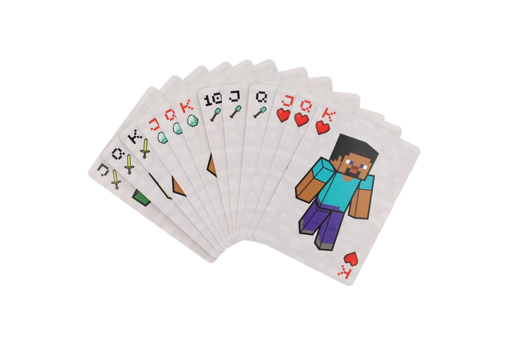 Hrací karty Minecraft musí mít každý milovník populární počítačový hry Minecraft. Díky skladnímu balení si je můžete vzít i na výlet. Sada obsahuje 54 karet. Vhodné pro děti od 6 let.