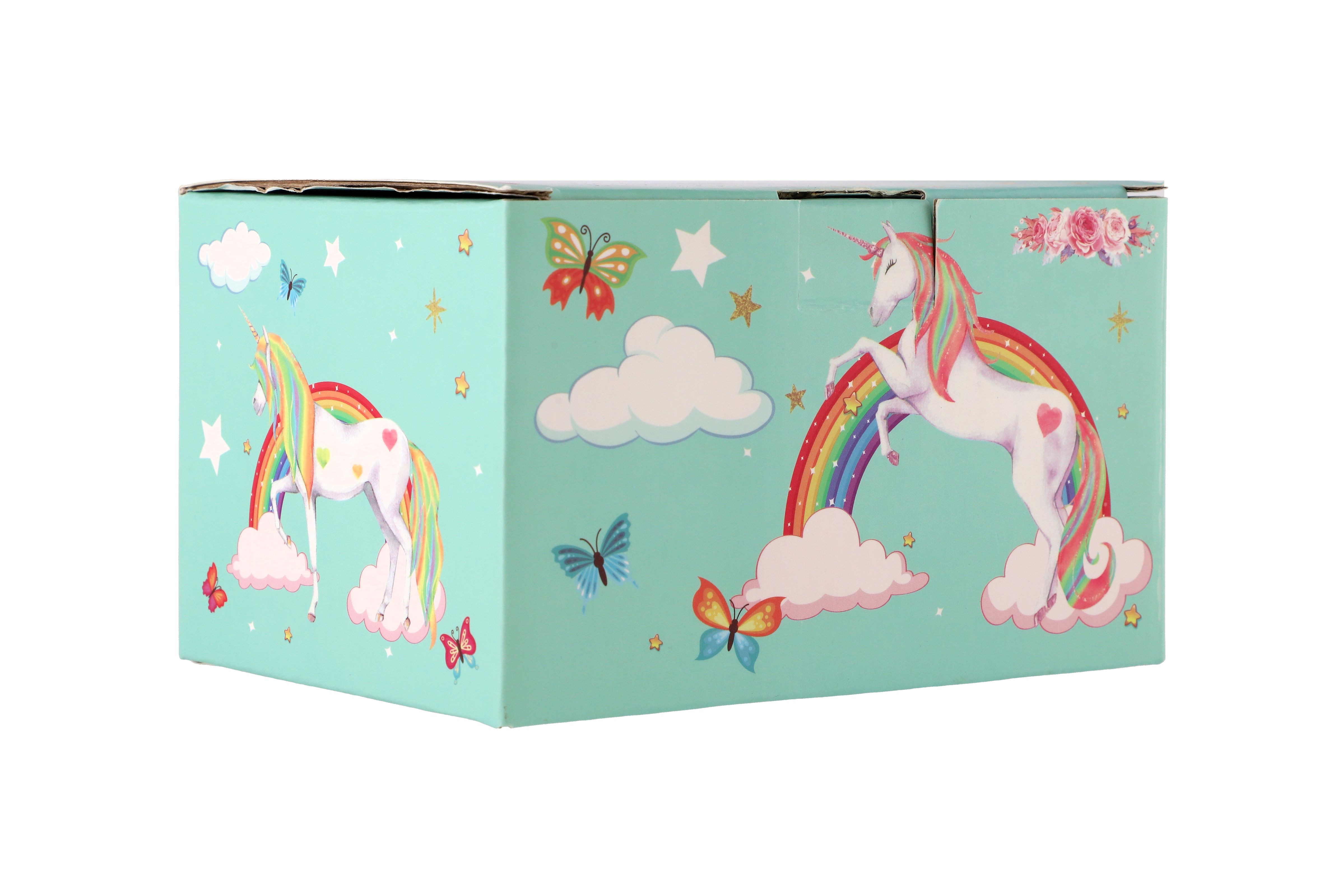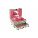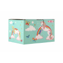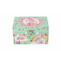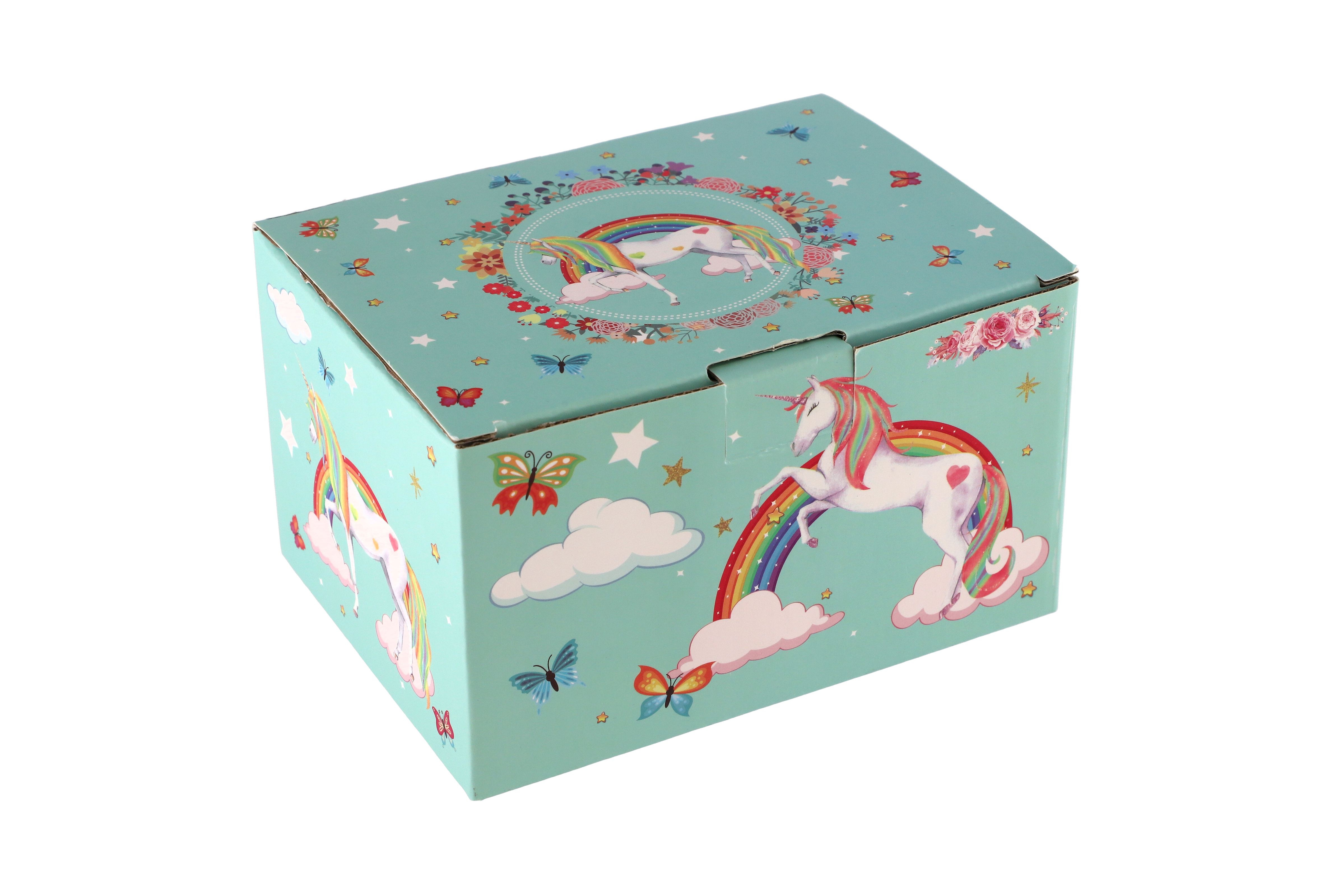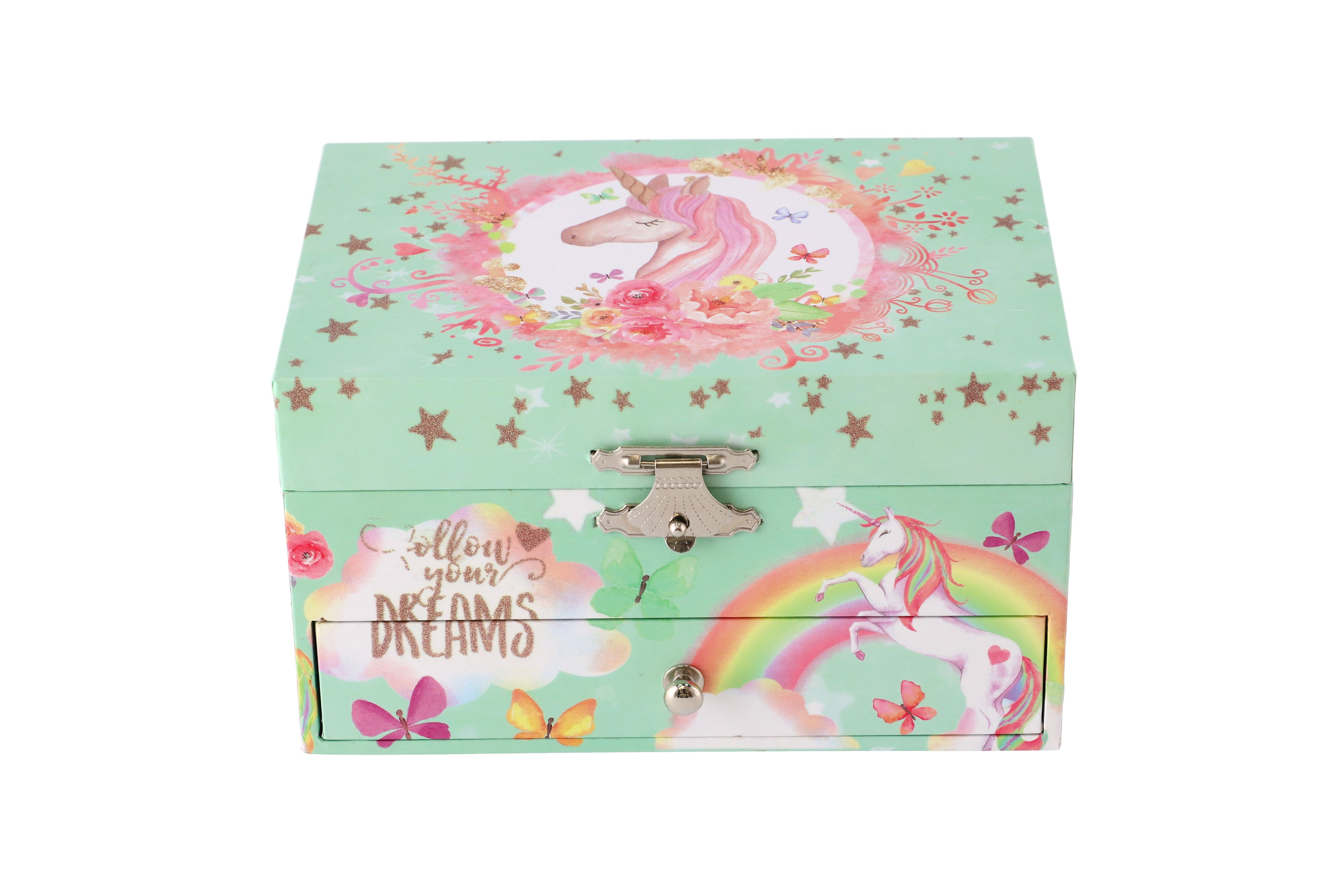 Tato kazeta s hrací skříňkou je stylizovaná na šperkovnici a bude ideálním místem pro uložení pokladů každé dívky. Kazeta je vyrobena z odolného kartonu v pastelově zelené barvě, a je zdobena hvězdami a motivem jednorožce, což z něj dělá ideální doplněk pro dětský pokoj. Kazeta má kovová, postříbřená držadla a pevné závěsy. Pod krytem se zrcadlem je prostor pro pořádání suvenýrů nebo šperků. Také zde je bílo-růžový jednorožec, který se po natažení klíčku točí a hraje. Pod nimi je malá zásuvka pro další podrobnosti. Hrací skříňku se zapíná pomocí růžovo bílého poníka připojeného k sadě. Rozměr šperkovnice: 16 x 10 x 12 cm Není hračka