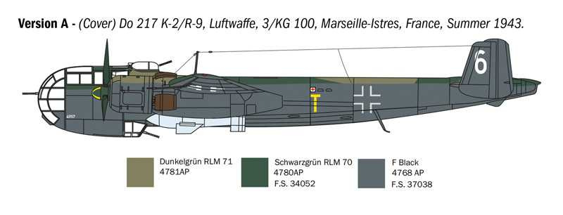 Informace o originálu: Dornier Do 217 byl dvoumotorový hornoplošník, který během druhé světové války hojně používala německá Luftwaffe. Letadlo, známé svou všestranností a přizpůsobivostí, bylo ve svých různých verzích schopné plnit širokou škálu misí, včetně strategického bombardování, útoků na hladině a nočních bojů. Varianta Dornier Do 217K se vyznačovala zejména zesíleným trupem, přepracovanými plochami křídel a vylepšenými motory. Byla dále vyvinuta pro nesení a nasazení rádiem naváděné bomby Ruhrstahl SD 1400 „Fritz X“ – pokročilé a průkopnické zbraně své doby – umístěné na podkřídlovém pylonu. S touto konfigurací byl Do 217K primárně nasazen ve Středomoří. 9. září 1943 byla italská bitevní loď Roma zasažena a potopena letounem Fritz X u pobřeží Sardinie.
