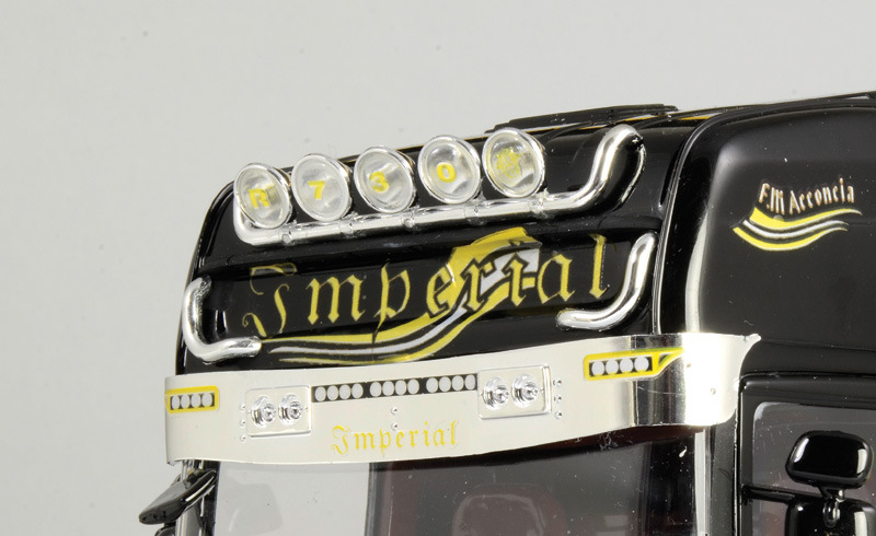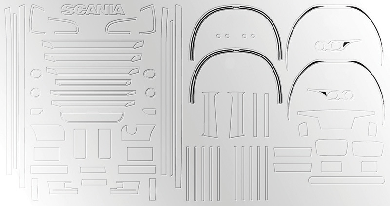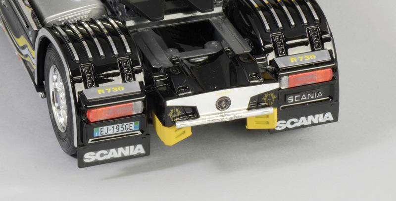 Těžké tahače Scania řady R jsou k dostání s motory V8 a byly vyvinuty na základě současných požadavků světového trhu. Tyto agregáty jsou postaveny tak, aby zvládly i ty nejtěžší úkoly, a obzvláště oceňována je jejich bytelnost, reaktivita a úspornost. Díky nim jsou vozy této řady připraveny splnit i ty nejnáročnější požadavky na spotřebu paliva a spolehlivost. Vzhled těchto strojů budí na silnici značně impozantní dojem a ne náhodou jsou považovány za jedničku na slavných akcích “SHOW TRUCKS”, na kterých se předvádějí vyšperkované tahače. Jejich výjimečná vizáž zároveň dobře ladí s exkluzivními novými interiéry, které posyktují řidiči vysokou úroveň pohodlí a zájemcům dávají na výběr z široké řady barev a materiálů. Kromě toho je navíc tento model dotažen k dokonalosti pomocí fantastických obtisků a „pokovených“ samolepek okamžitě připravených k použití. Balení dále obsahuje také nové plastové části imitující chrom, které modelu ještě přidávají na realistickém vzezření.