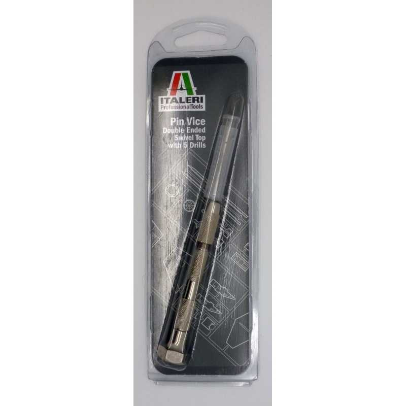 Praktický držák (minivrtačka) určená pro práci s vrtáky, závitníky, rýsovacími jehlami apod. Obsahuje dvě oboustranné kleštiny umožňující upnutí vrtáků o průměru 0–1,2 mm, 1,3–2,4 mm a 0,8–2,0 mm, 1,8–2,9 mm. Držák je v horní části vybaven otočnou šestihrannou hlavou, která při práci zajišťuje maximální pohodlí a efektivitu. Součástí balení je 5 vrtáků o průměru 1,0; 1,2; 1,4; 1,5 a 1,8 mm.