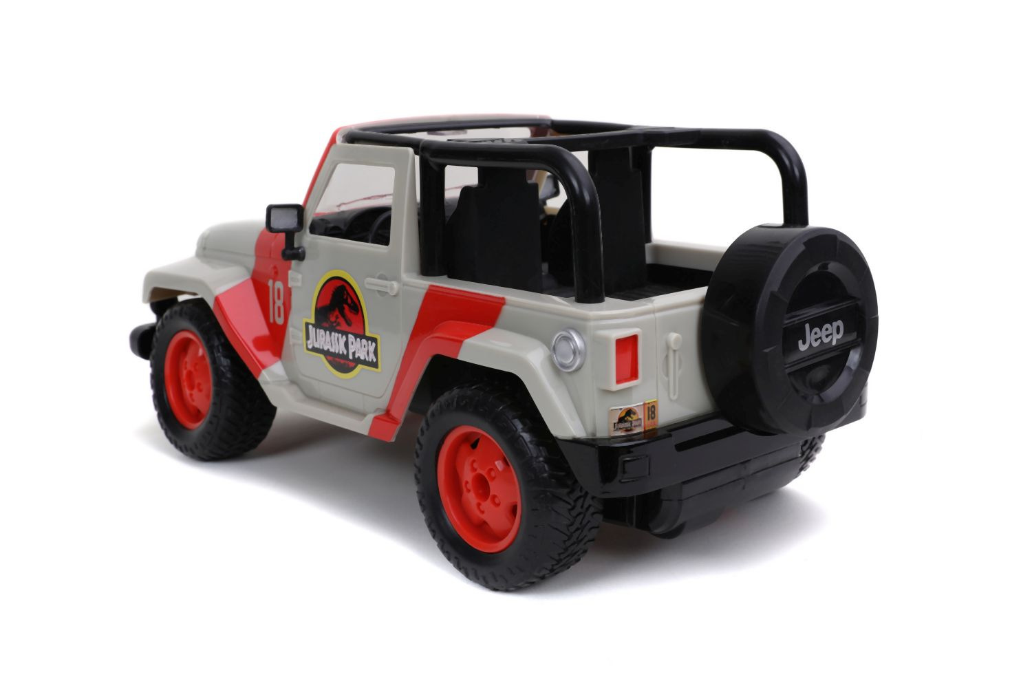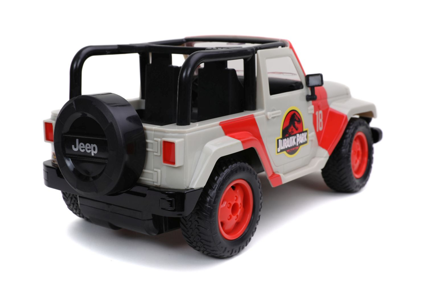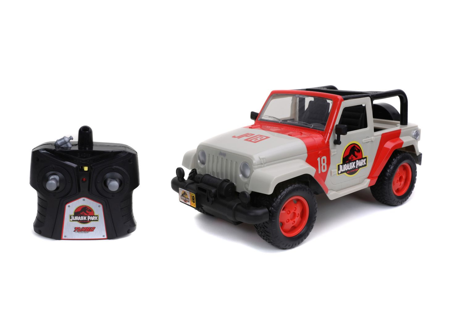 Auto Jurassic World Jeep Wrangler na dálkové ovládání. 2 kanály (jezdí vpřed, vzad, vlevo a vpravo). Funkce turbo. Frekvence 2,4 GHz.Dosahuje rychlosti až 9 km/h. Délka 30 cm. Barva červená a béžová. V měřítku 1:16.