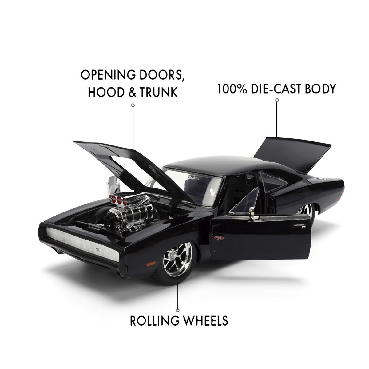Kovový model auta Dodge Charger 1970 v měřítku 1:24 z filmu Rychle a zběsile. Na volnoběh, otevírací dveře, kufr a kapota. Velikost 21 cm.