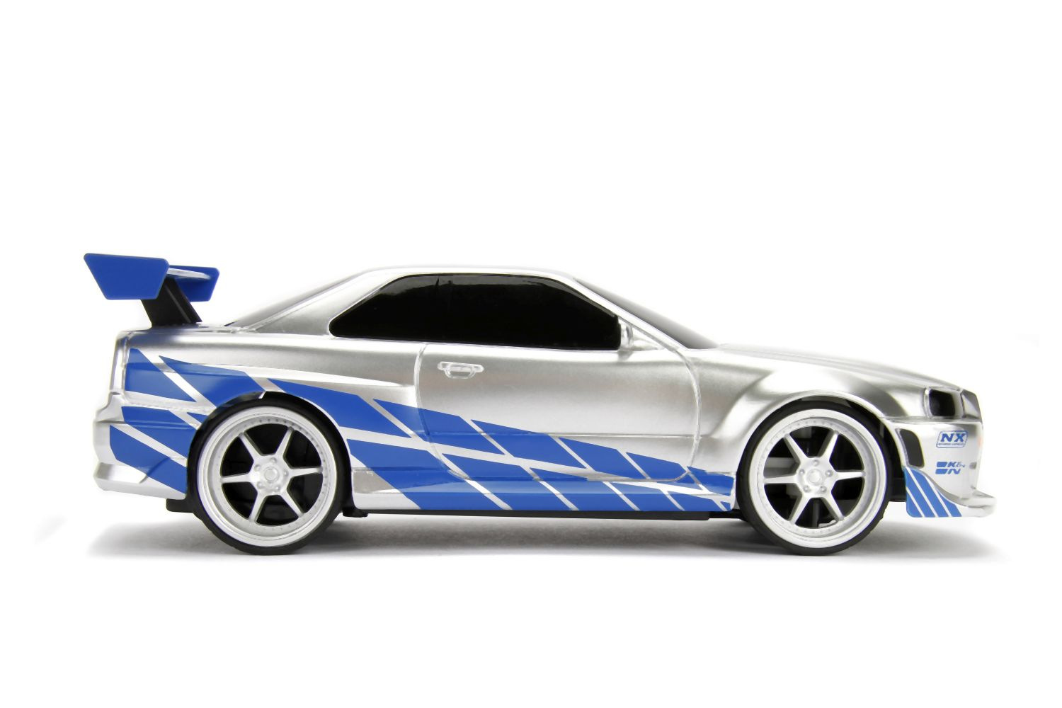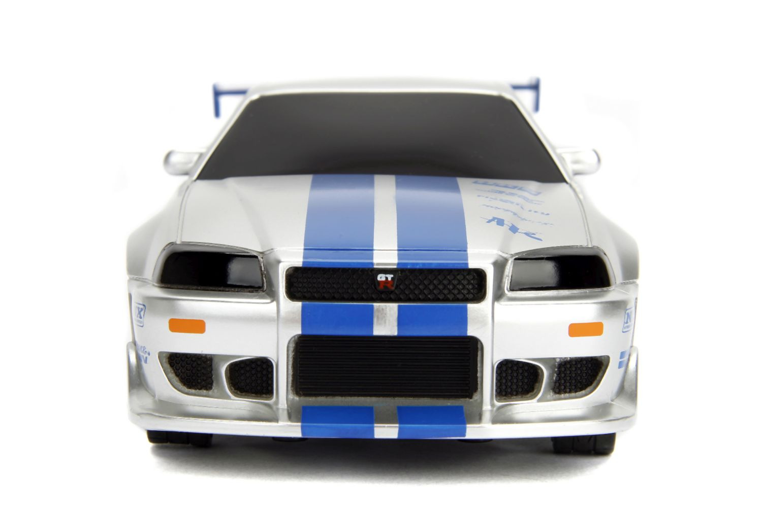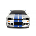 Brianovo auto Nissan Skyline GT-R (BNR34) na dálkové ovládání z akčního filmu Rychle a zběsile. 2 kanály (jezdí vpřed, vzad, vlevo a vpravo). Frekvence 2,4 GHz. Turbo funkce. Maximální rychlost 8,2 km/hod. Barva stříbrná a modrá. V měřítku 1:24.
