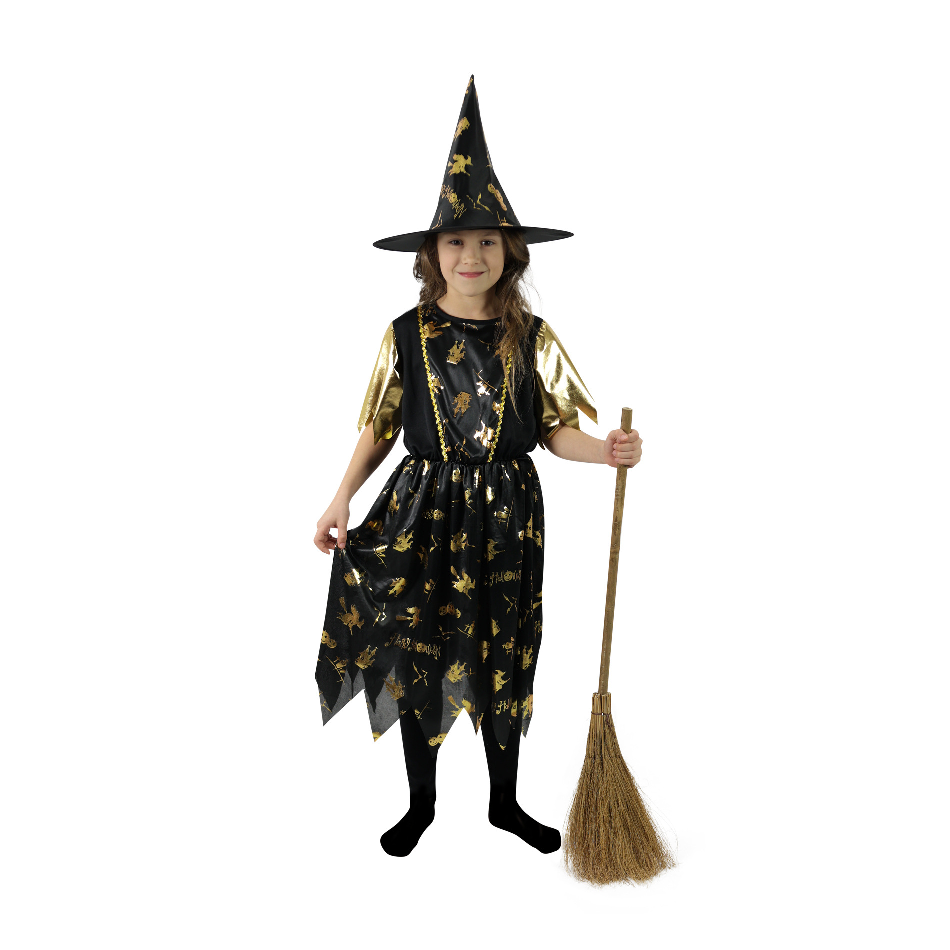 Halloweenský kostým pro malé čarodějnice! Kostým černo-zlaté barvy ve velikosti S je určen pro holčičky ve věkovém rozmezí 4-6 let (105-116 cm). Šaty jsou dekorovány zlatými halloweenskými motivy. Součástí kostýmu je perfektně sladěný čarodějnický klobouk. S tímto úchvatným kostýmem se zaručeně staneš hvězdou karnevalu i Halloweenu!